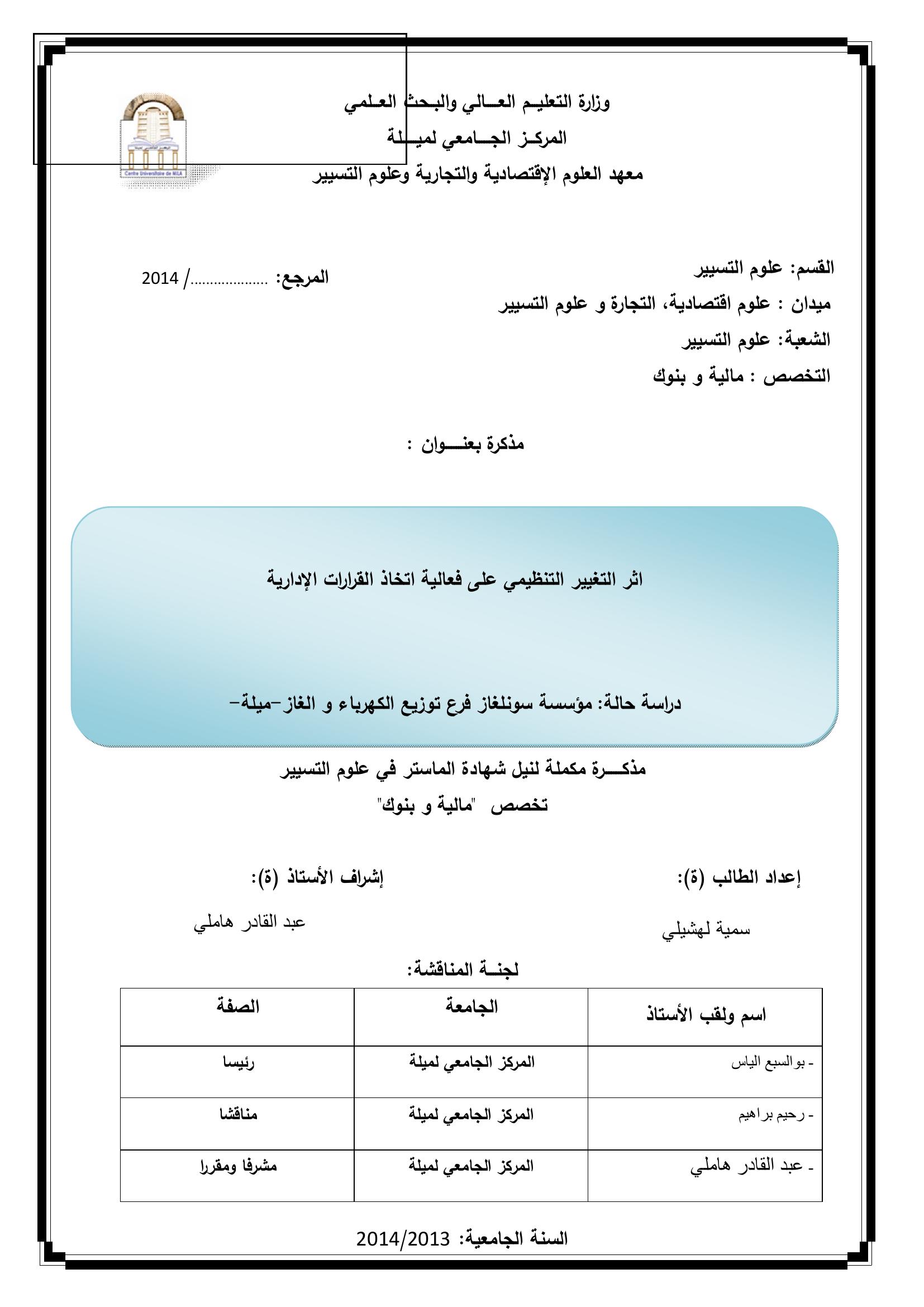 لهشيلي سمية & ،بن سبع إلياس(رئيسا)، رحيم إبراهيم(مناقشا)،عبد القادر هاملي(مشرفا ومقررا) (2014). أثر التغيير التنظيمي على فعالية اتخاذ القرارات الإدارية دراسة حالة مؤسسة سونلغاز فرع توزيع الكهرباء والغاز - ميلة -.