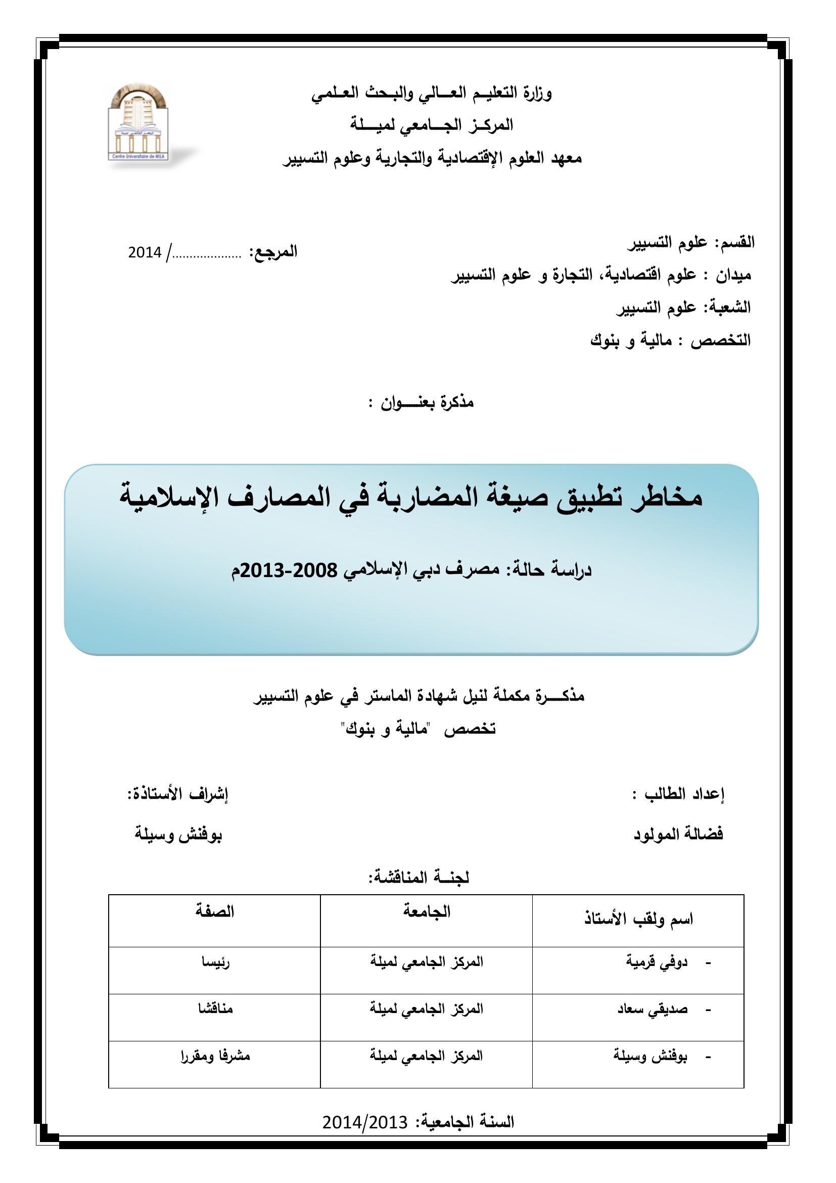 فضالة المولود & ،دوفي قرمية(رئيسا)، صديقي سعادمناقشا)، بوفنش وسيلة(مشرفا ومقررا) (2014). مخاطر تطبيق صيغة المضاربة في المصارف الإسلامية دراسة حالة مصرف دبي الإسلامي 2008-2013.
