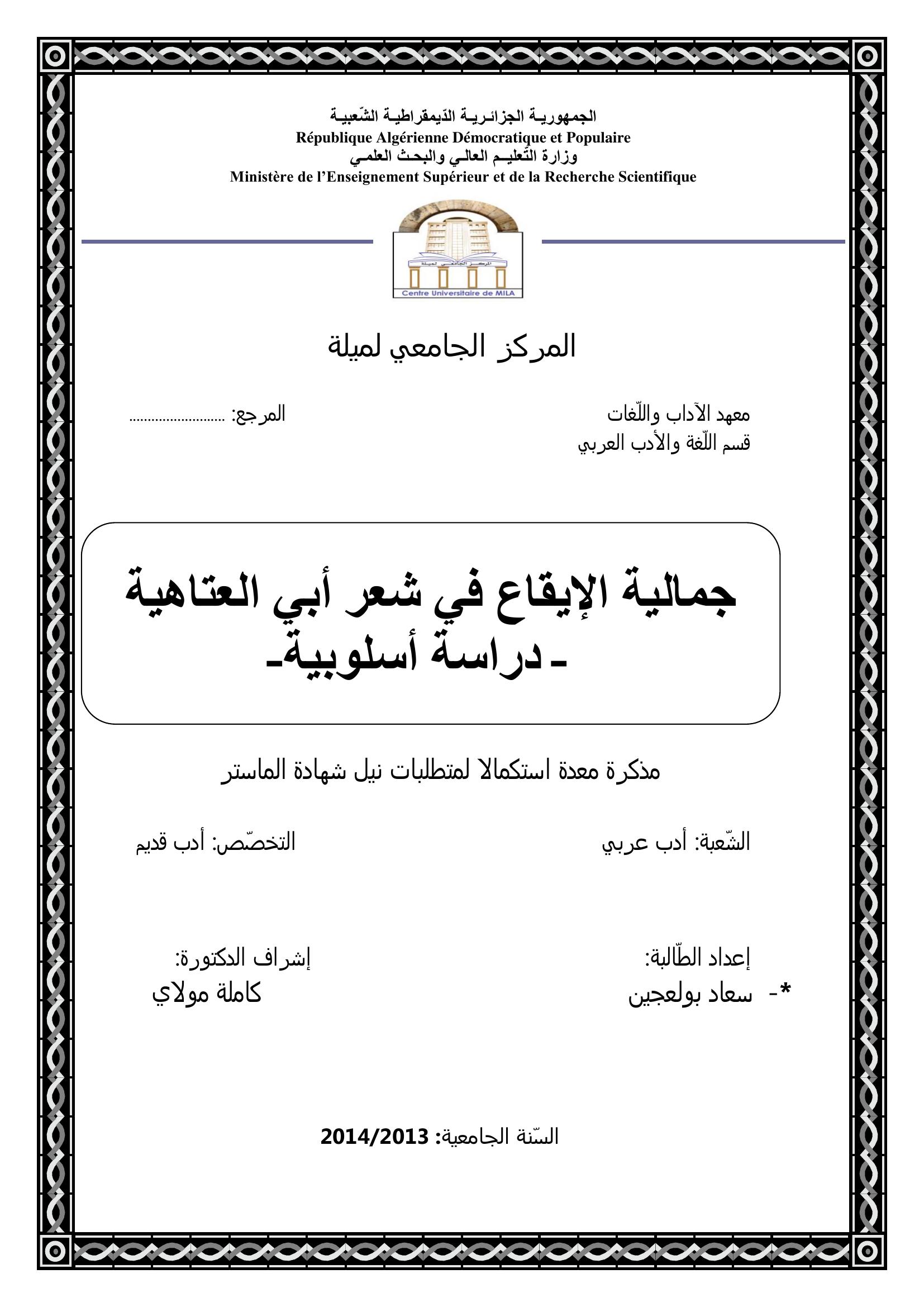 بولعجين سعاد & مولاي كاملة (مشرفا) (2014). جمالية الإيقاع في شعر أبي العتاهية - دراسة أسلوبية -.