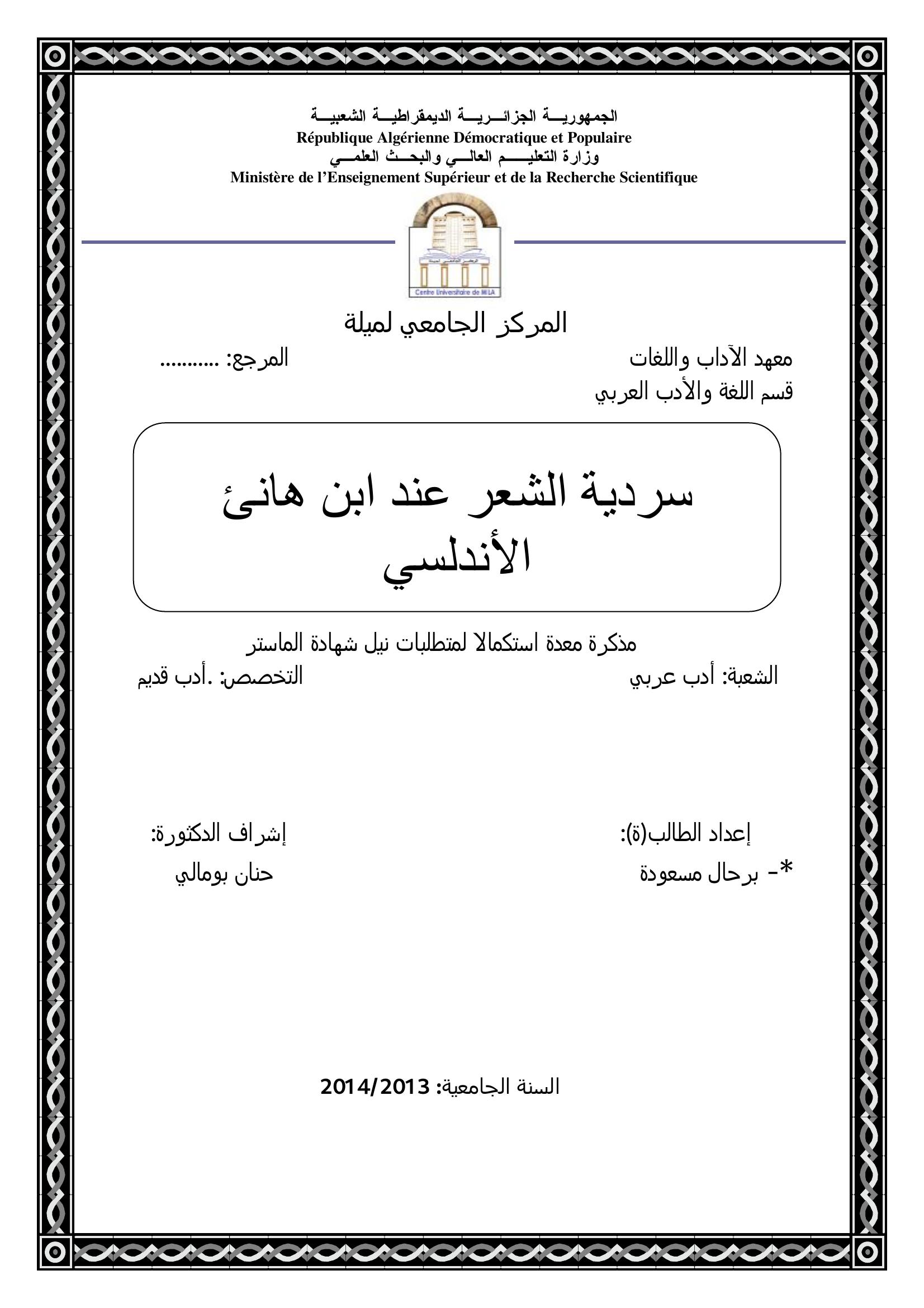 برحال مسعودة & بومالي حنان (2014). سردية الشعر عند ابن هانئ الأندلسي.
