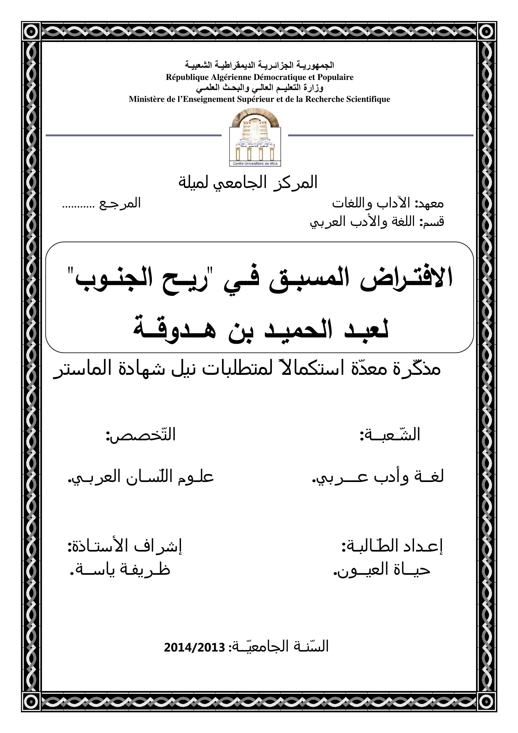 العيون حياة & ظريفة ياسة(مشرفا) (2014). الافتراض المسبق في "ريح الجنوب" لعبد الحميد بن هدوقة.