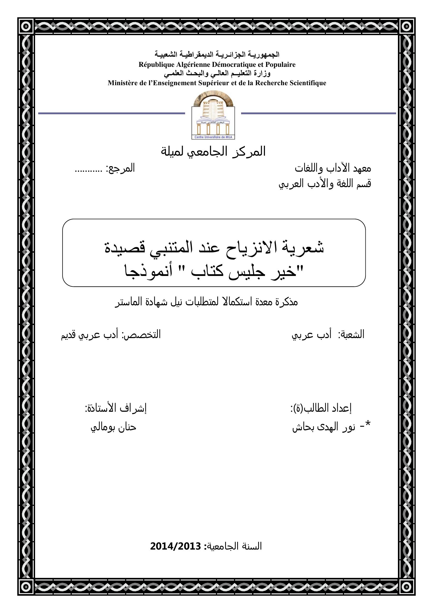 بحاش نور الهدى & بومالي حنان (2014). شعرية الانزياح عند المتنبي قصيدة "خير جليس كتاب" أنموذجا.