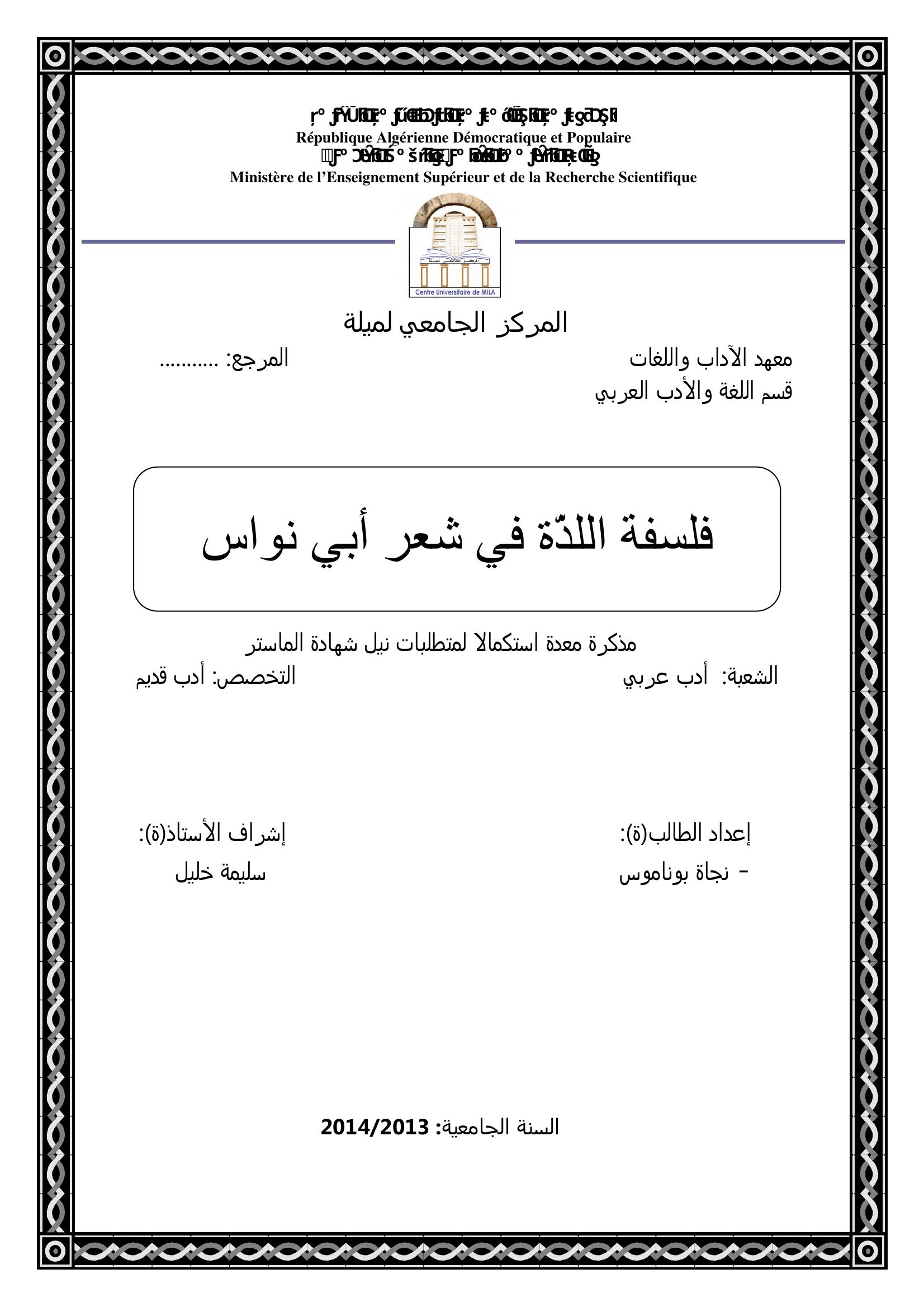 بوناموس نجاة & خليل سليمة (مشرفا) (2014). فلسفة اللذة في شعر أبي نواس.