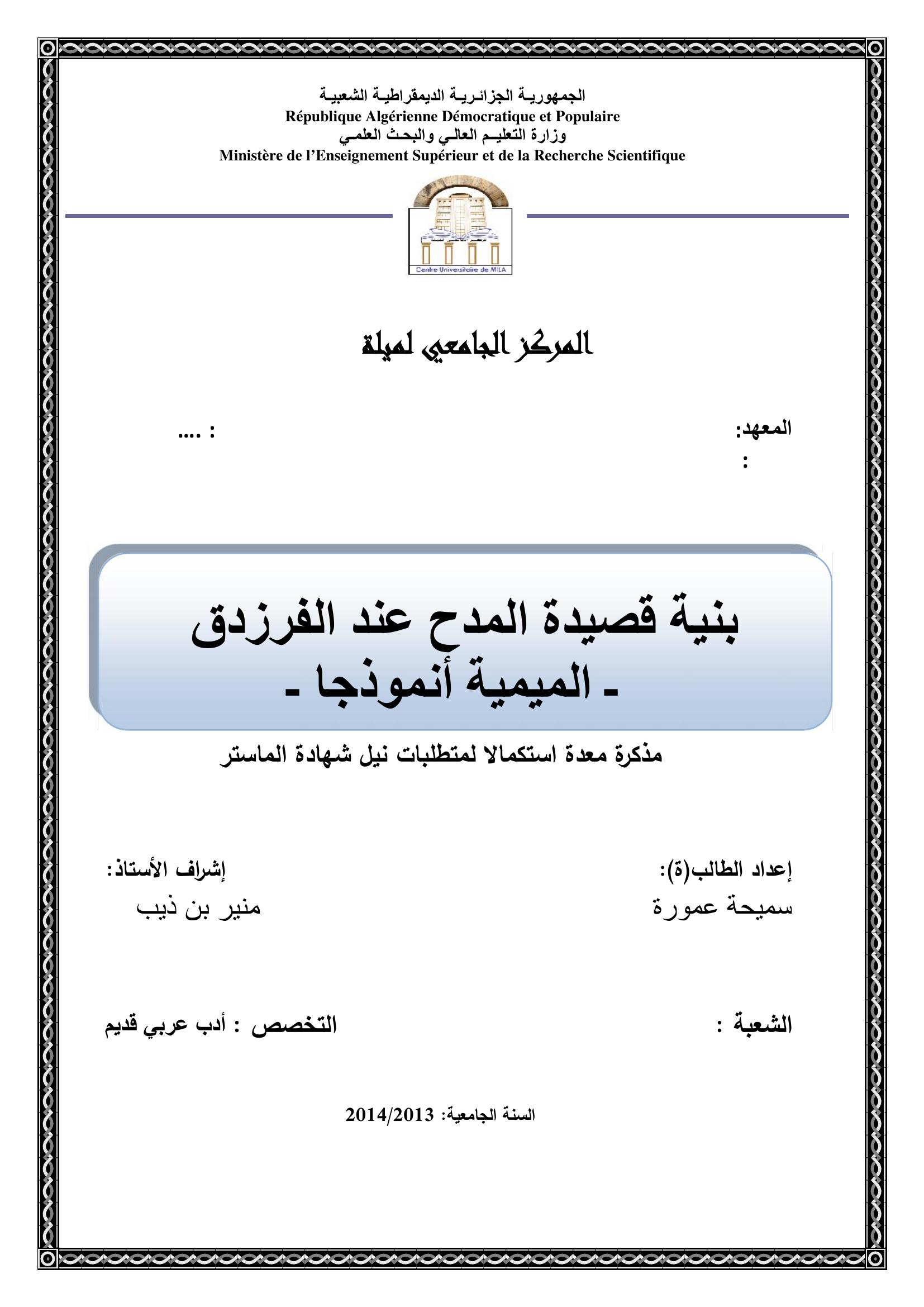 عمورة سميحة & بن ذيب منير (مشرفا) (2014). بنية قصيدة المدح عند الفرزدق - الميمية أنموذجا -.