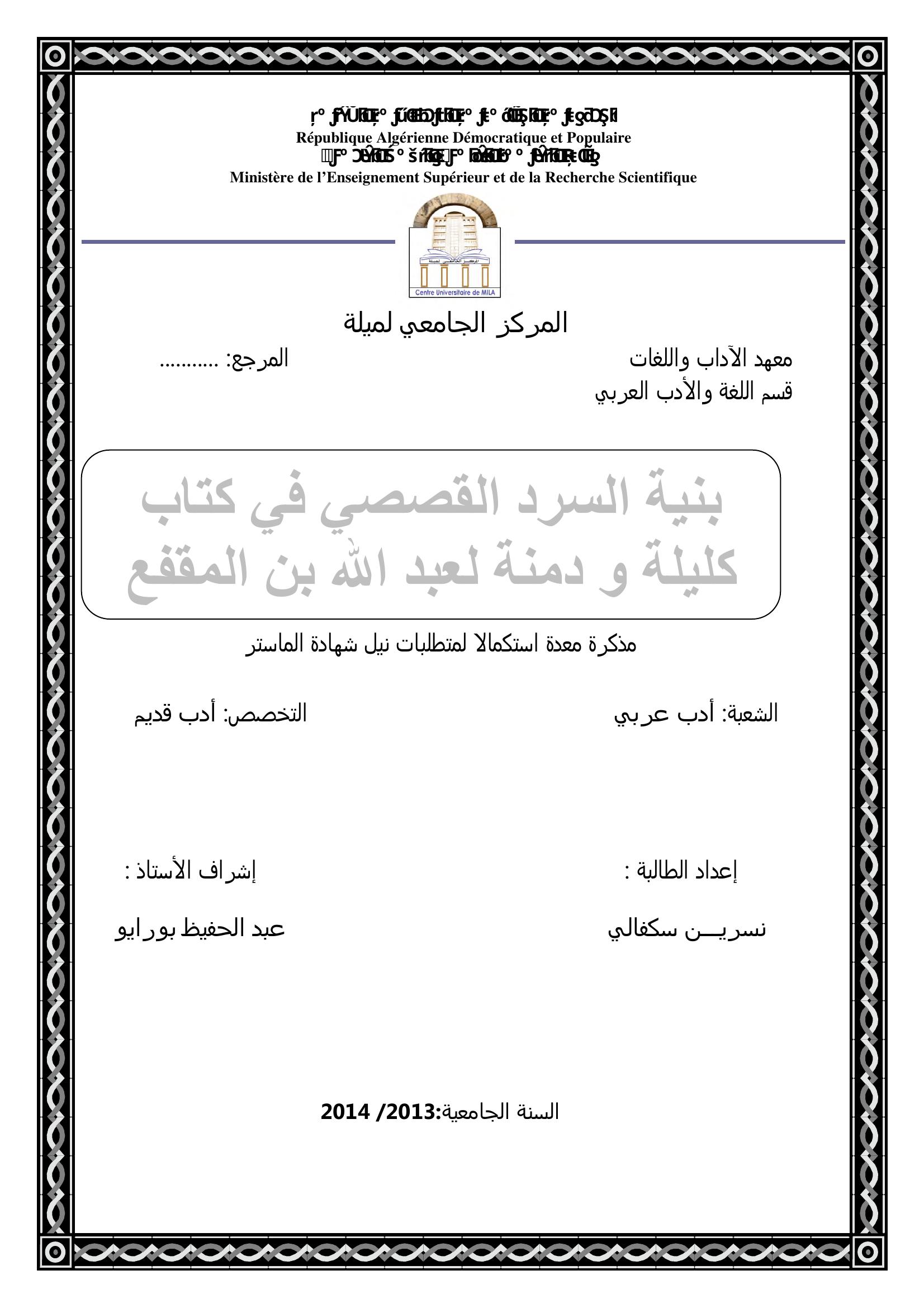 سكفالي نسرين & بورايو عبد الحفيظ (مشرفا) (2014). بنية السرد القصصي في كتاب كليلة ودمنة لعبد الله بن المقفع.