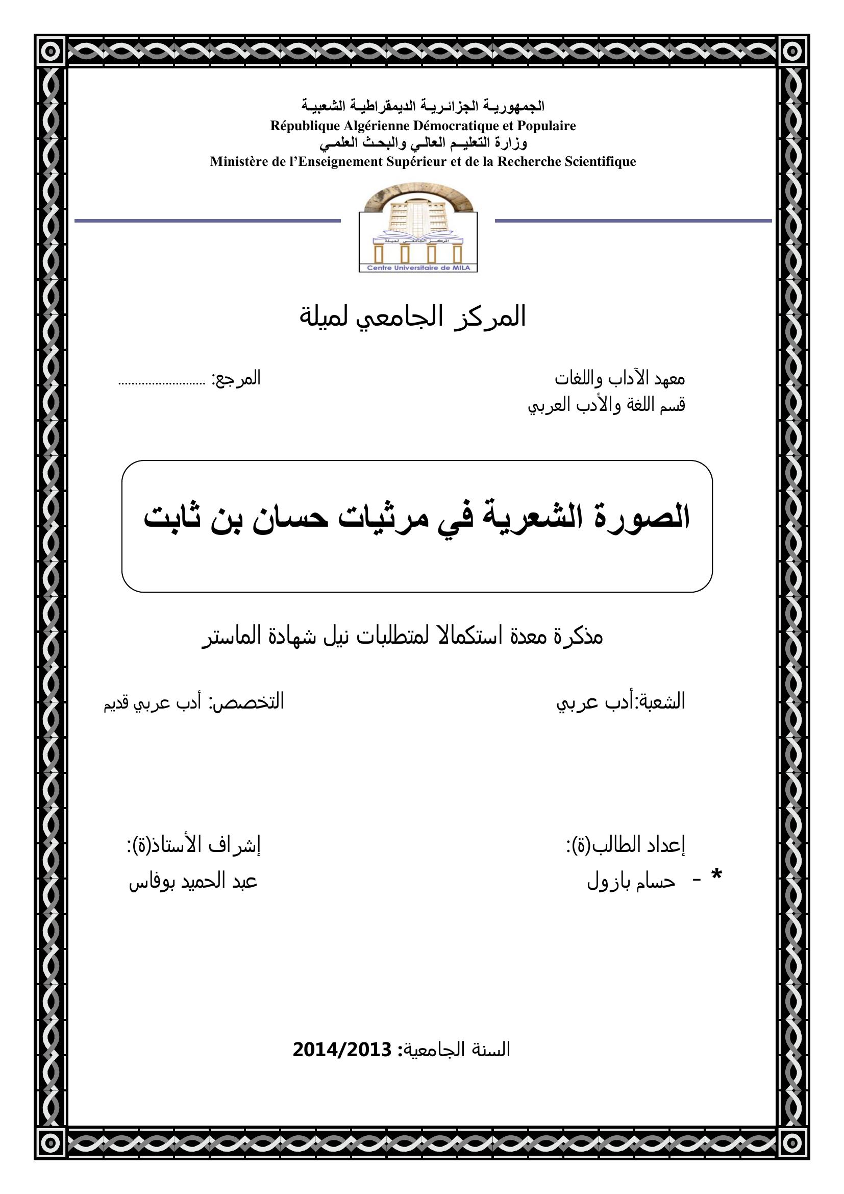 بازول حسام & بوفاس عبد الحميد(مشرفا) (2014). الصورة الشعرية في مرثيات حسان بن ثابت.