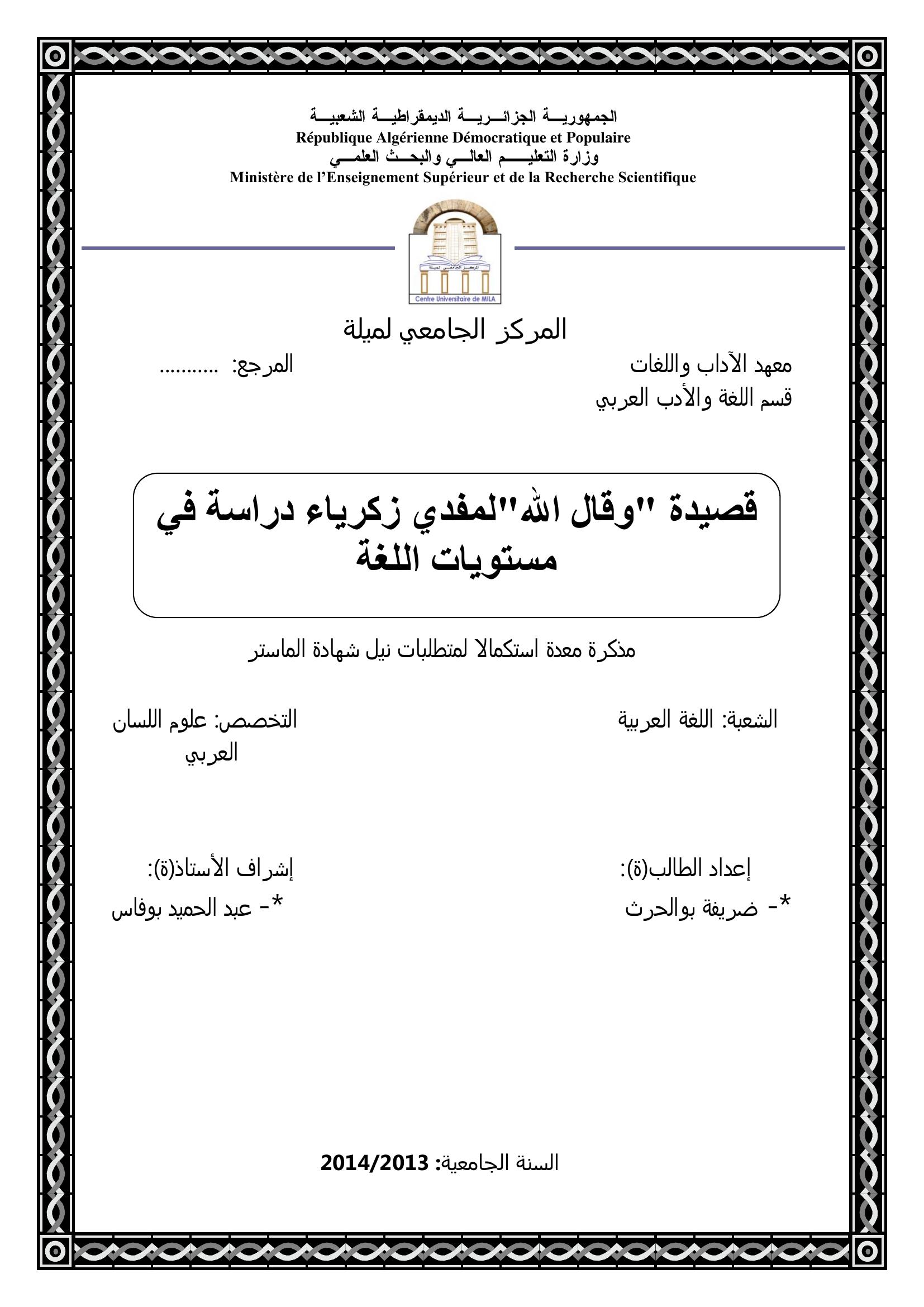 بوالحرث ضريفة & بوفاس عبد الحميد(مشرفا) (2014). قصيدة "وقال الله" لمفدي زكرياء دراسة في مستويات اللغة.