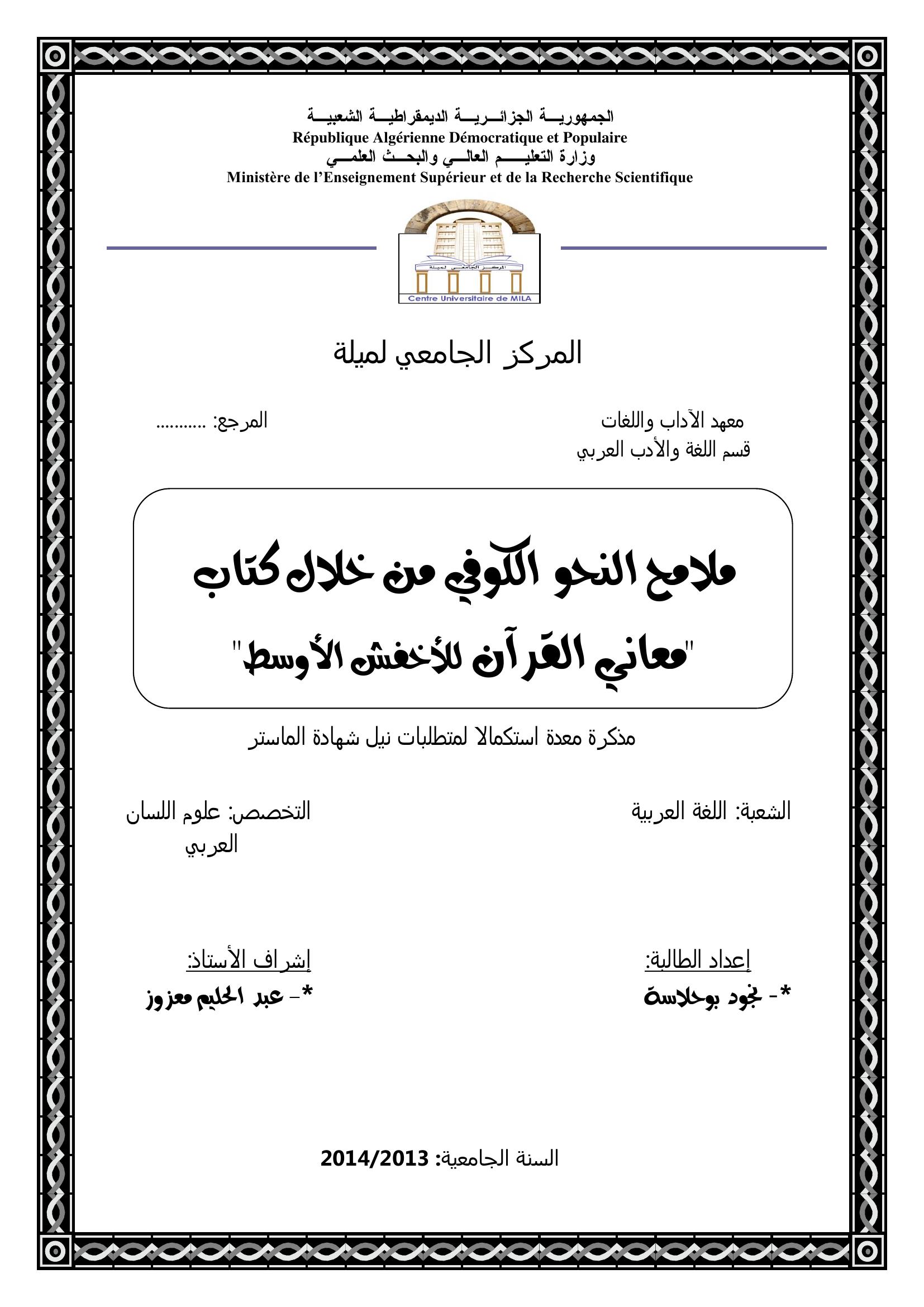 بوحلاسة نجود & معزوز عبد الحليم (مشرفا) (2014). ملامح النحو الكوفي من خلال كتاب "معاني القرآن للأخفش الأوسط".