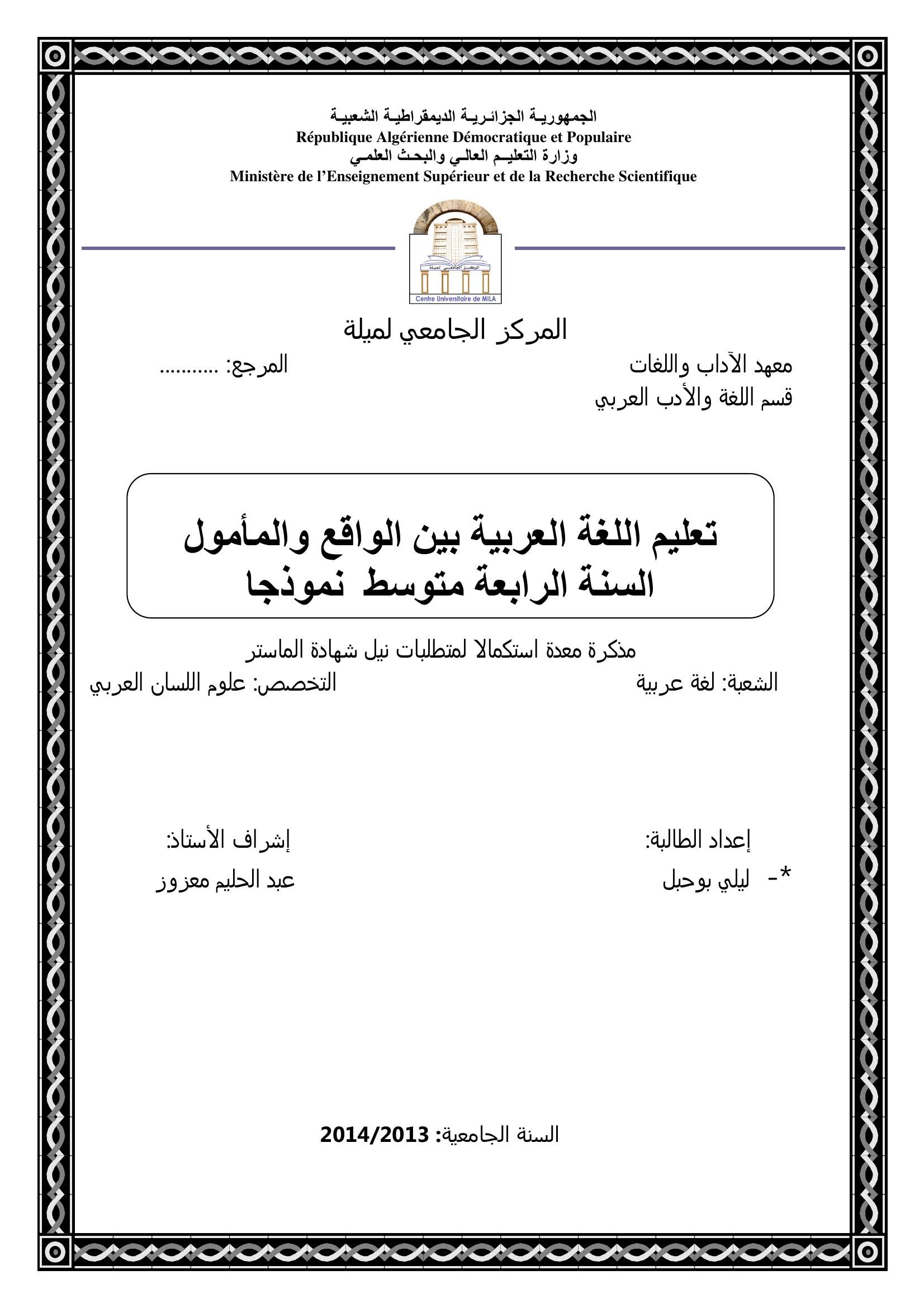 بوحبل ليلى & معزوز عبد الحليم (مشرفا) (2014). تعليم اللغة العربية بين الواقع والمأمول السنة الرابعة متوسط نموذجا.