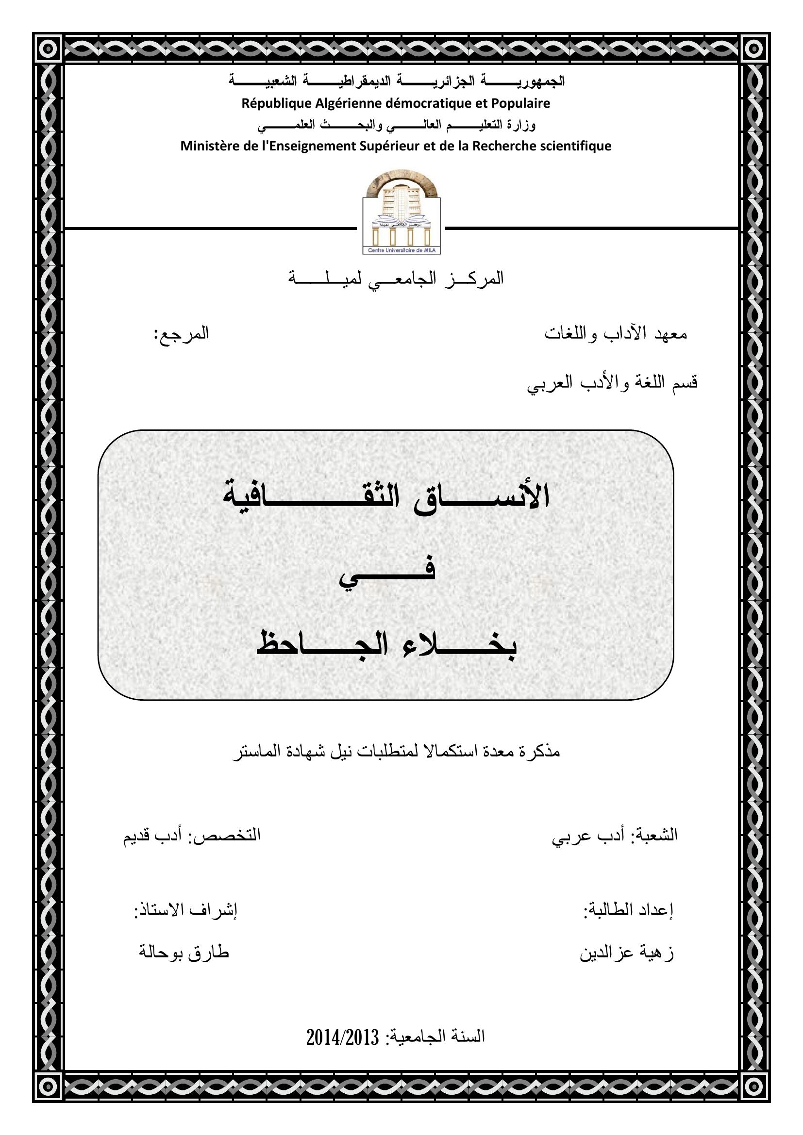 عزالدين زهية & بوحالة طارق (مشرفا) (2014). الأنساق الثقافية في بخلاء الجاحظ.