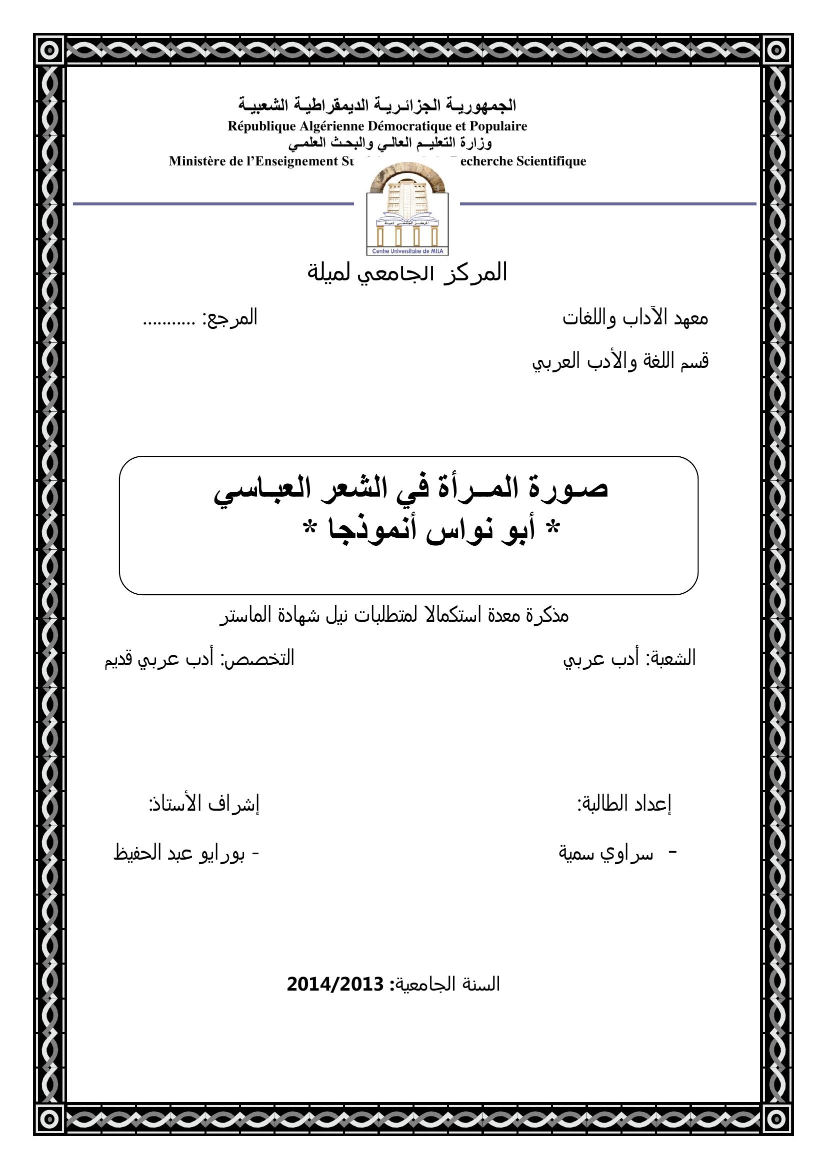 سراوي سمية & بورايو عبد الحفيظ (مشرفا) (2014). صورة المرأة في العصر العباسي *أبو نواس أنموذجا*.