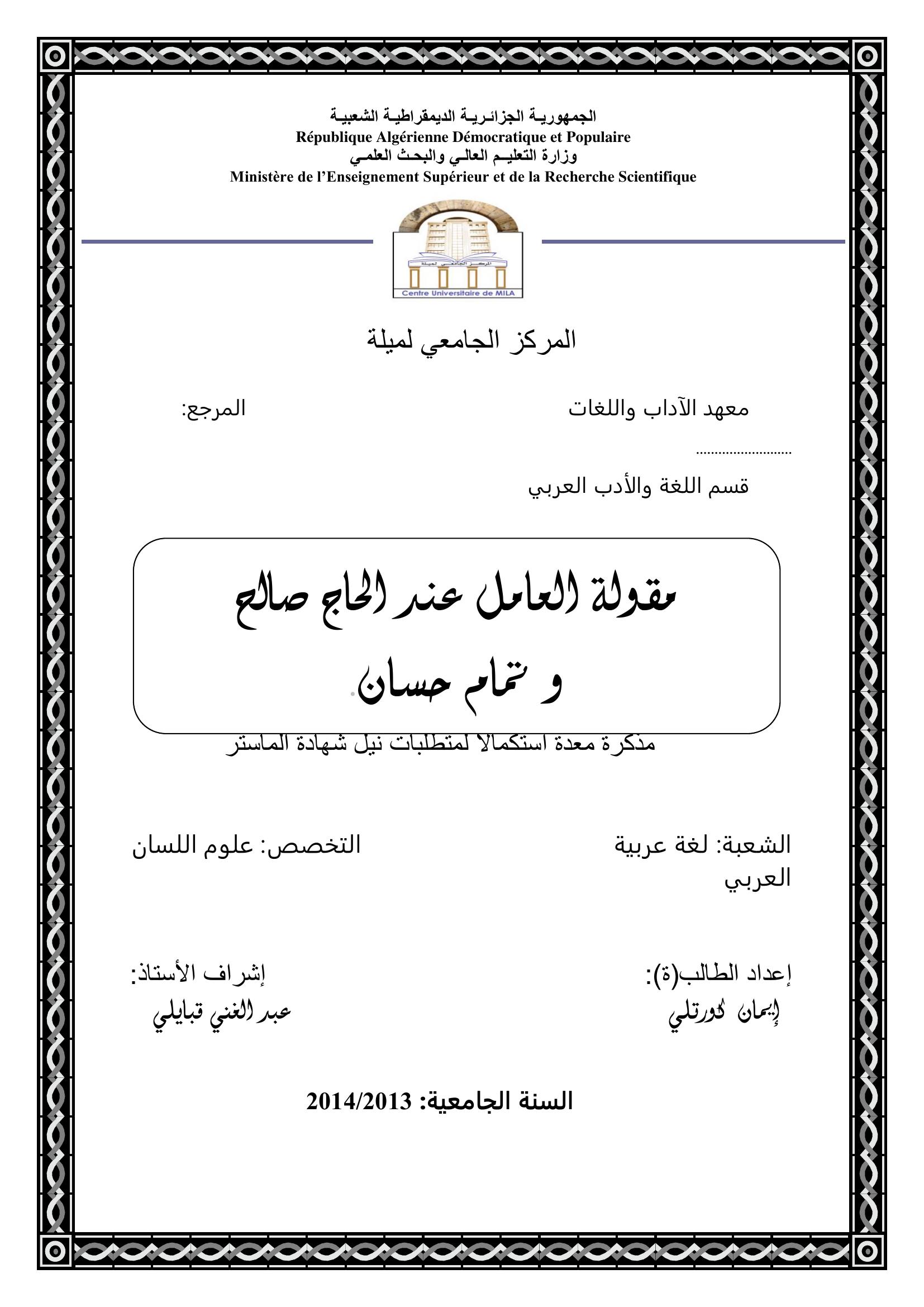 كورتلي إيمان & قبايلي عبد الغاني (مشرفا) (2014). مقولة العامل عند الحاج صالح وتمام حسان.