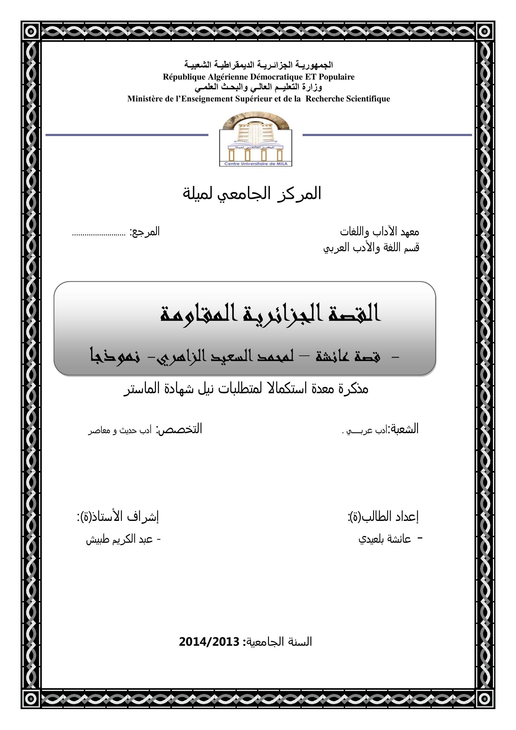 بلعيدي عائشة & طبيش عبد الكريم(مشرفا) (2014). القصة الجزائرية المقاومة - قصة عائشة - لمحمد السعيد الزاهري - نموذجا.