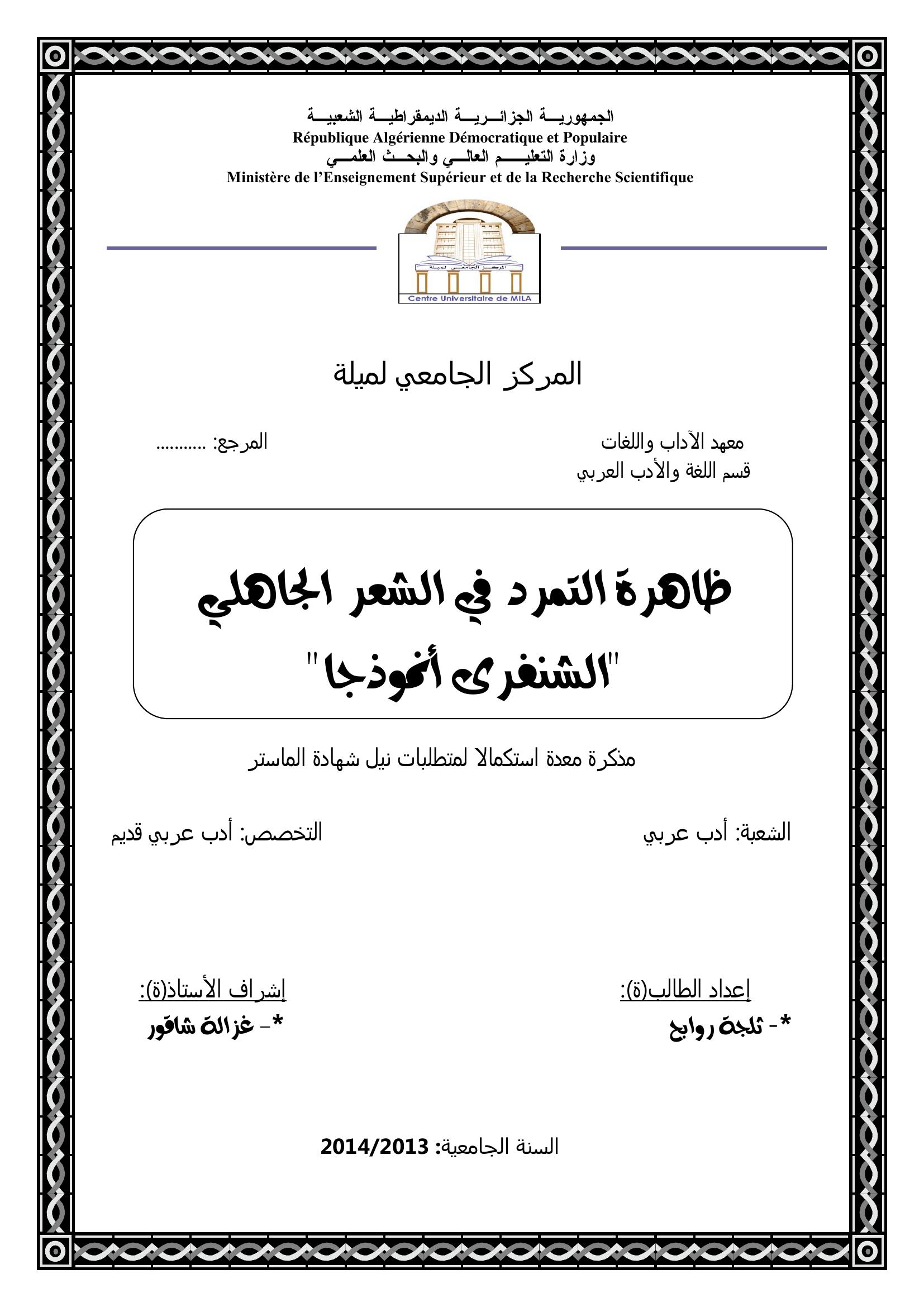 روابح ثلجة & شاقور غزالة ( مشرفا) (2014). ظاهرة التمرد في الشعر الجاهلي "الشنفرة أنموذجا".