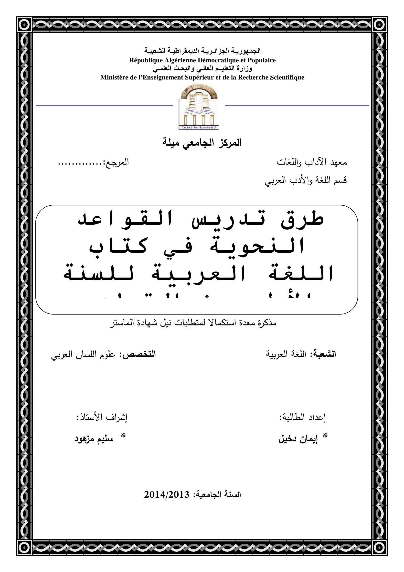 دخيل إيمان & مزهود سليم (مشرفا) (2014). طرائق تدريس القواعد النحوية في كتاب اللغة العربية للسنة الأولى من التعليم المتوسط.