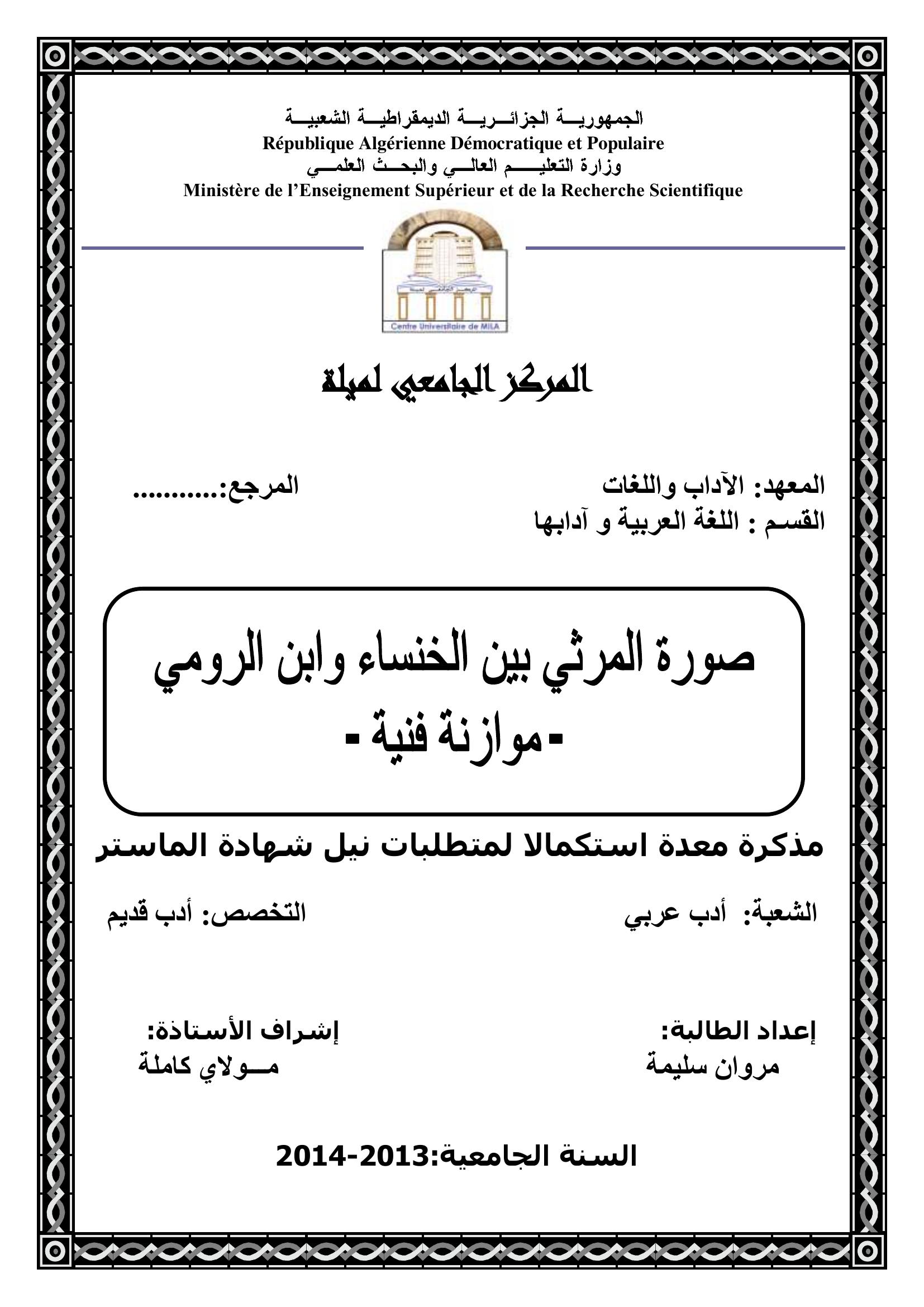 مروان سليمة & مولاي كاملة (مشرفا) (2014). صورة المرثي بين الخنساء وابن الرومي - موازنة فنية-.