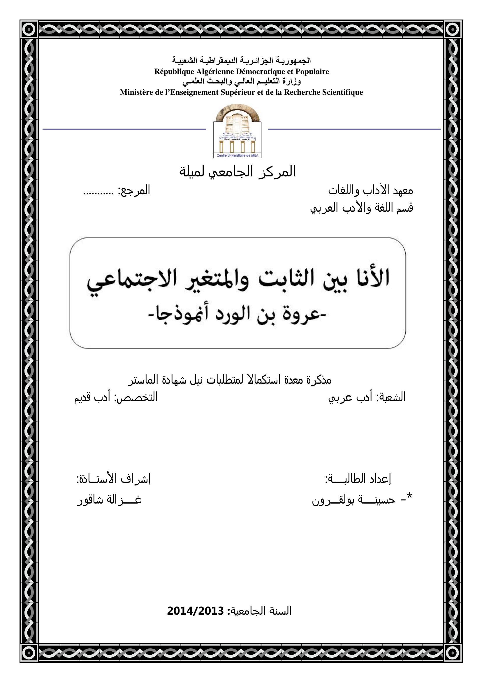 بولقرون حسينة & شاقور غزالة ( مشرفا) (2014). الأنا بين الثابت والمتغير الاجتماعي- عروة بن الورد أنموذجا -.
