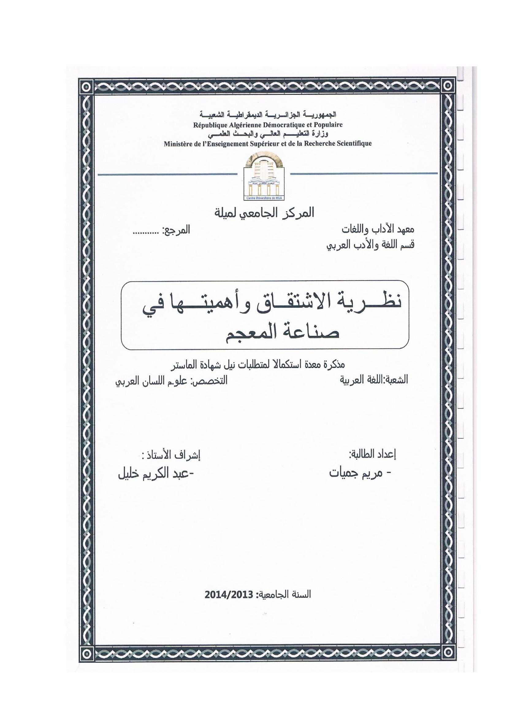 جميات مريم & خليل عبد الكريم (مشرفا) (2014). نظرية الاشتقاق وأهميتها في صناعة المعجم.