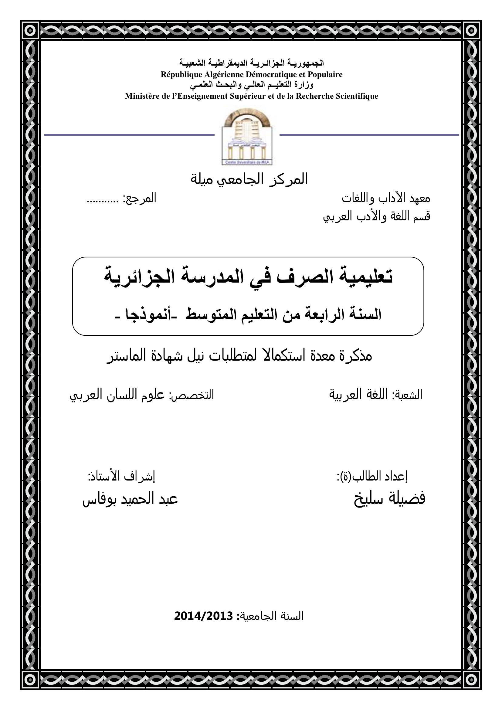 سليخ فضيلة & بوفاس عبد الحميد(مشرفا) (2014). تعليمة الصرف في المدرسة الجزائرية السنة الرابعة من التعليم المتوسط -أنموذجا-.