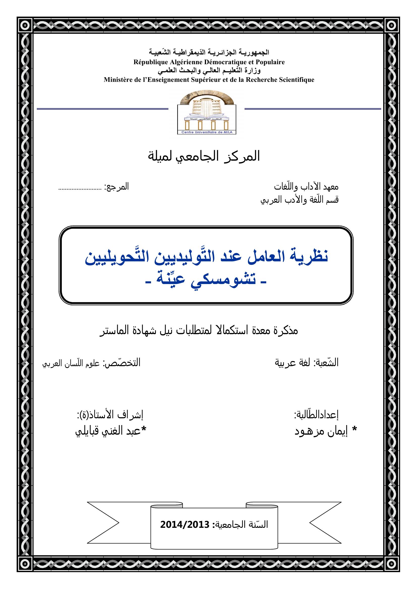 مزهود إيمان & قبايلي عبد الغاني (مشرفا) (2014). نظرية العامل عند التوليديين التحويليين - تشومسكي عينة-.