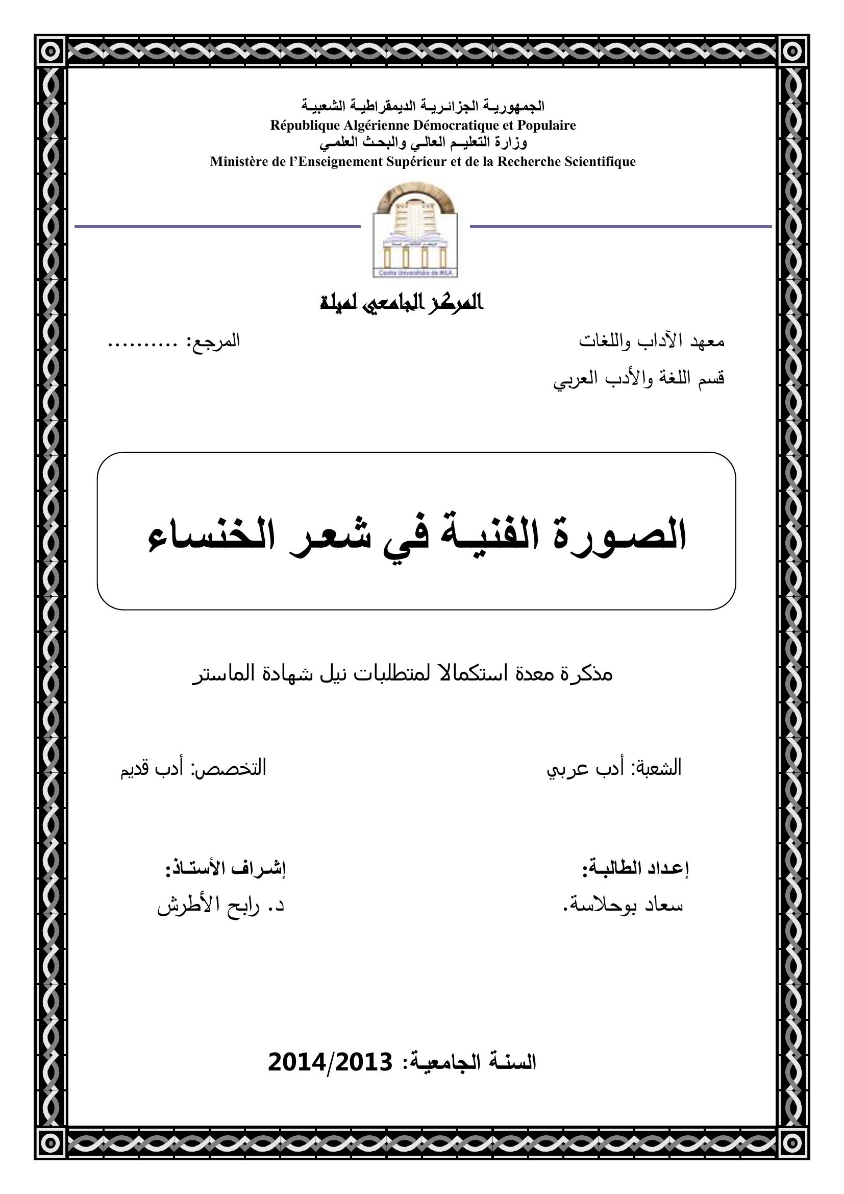 بوحلاسة سعاد & الأطرش رابح( مشرفا) (2014). الصورة الفنية في شعر الخنساء.