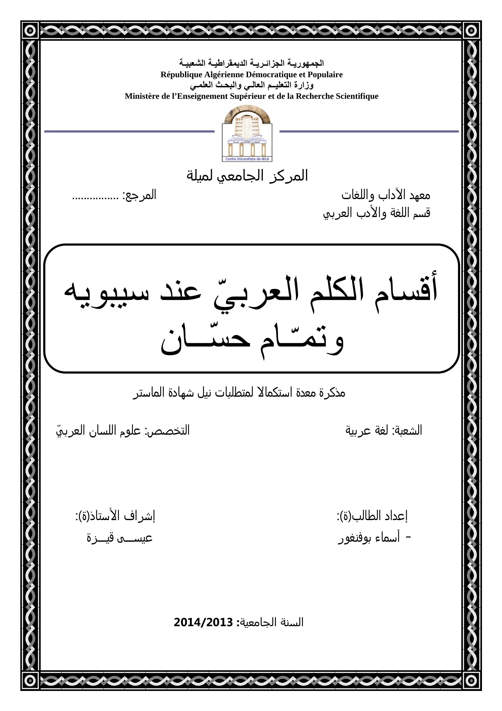 بوفنغور أسماء & قيزة عيسى ( مشرفا) (2014). أقسام الكلم العربي عند سيبويه وتمام حسان.