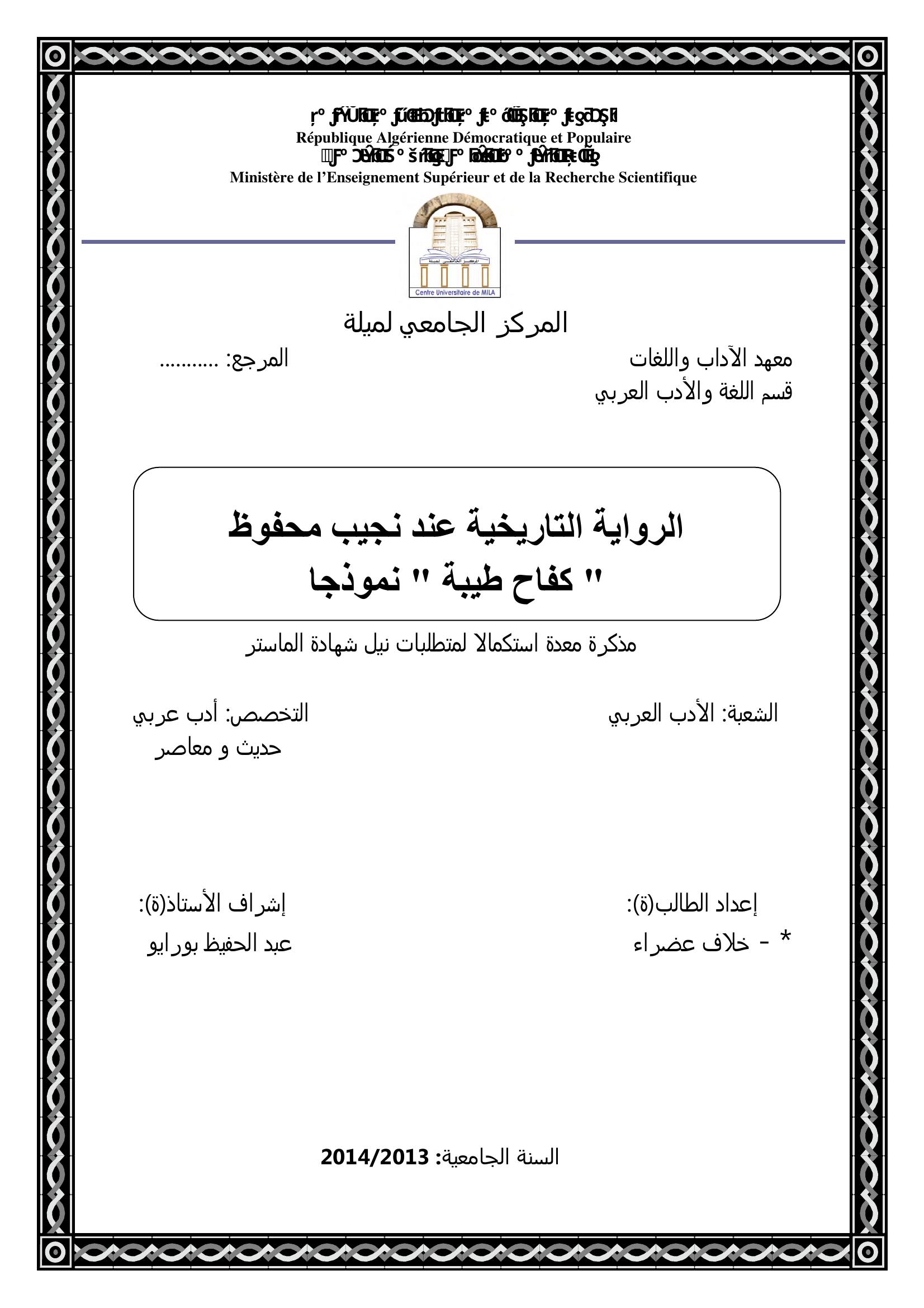 خلاف عضراء & بورايو عبد الحفيظ (مشرفا) (2014). الرواية التاريخية عند نجيب محفوظ " كفاح طيبة" نموذجا.