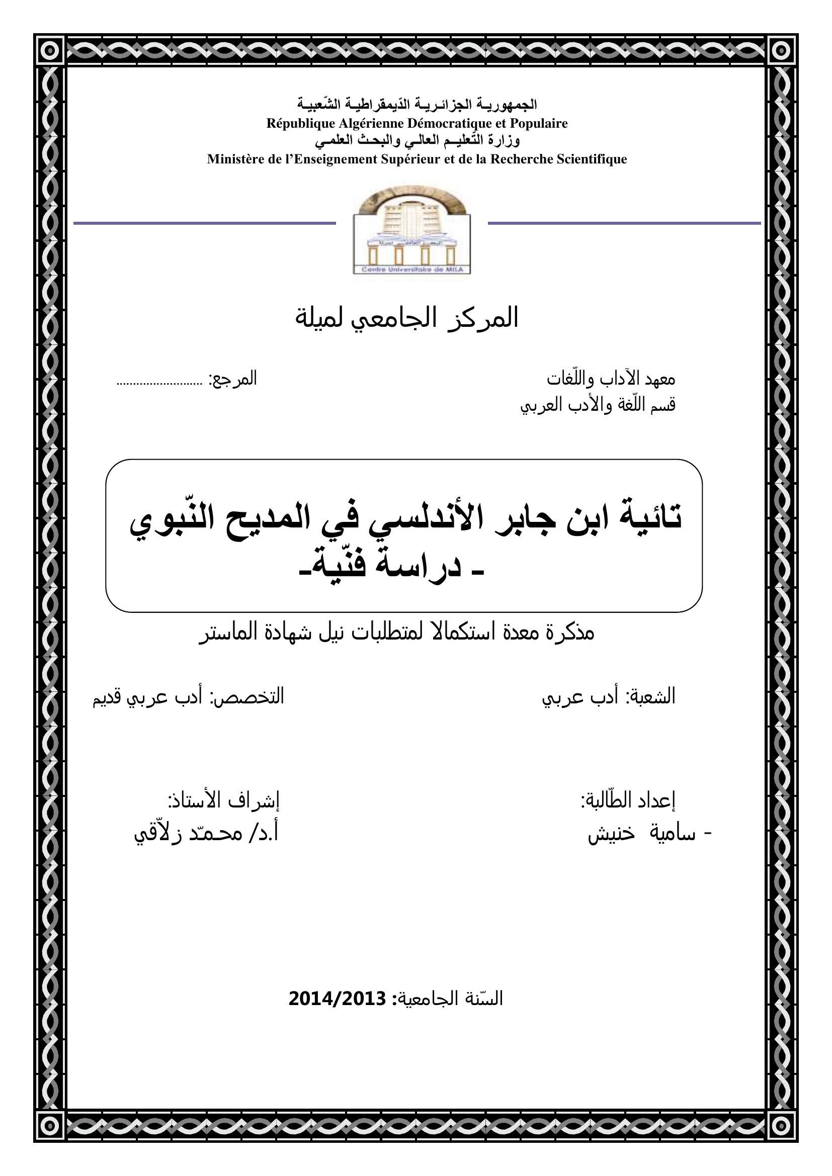 خنيش سامية & زلاقي محمد( مشرفا) (2014). تائية ابن جابر الأندلسي في المديح النبوي - دراسة فنية -.