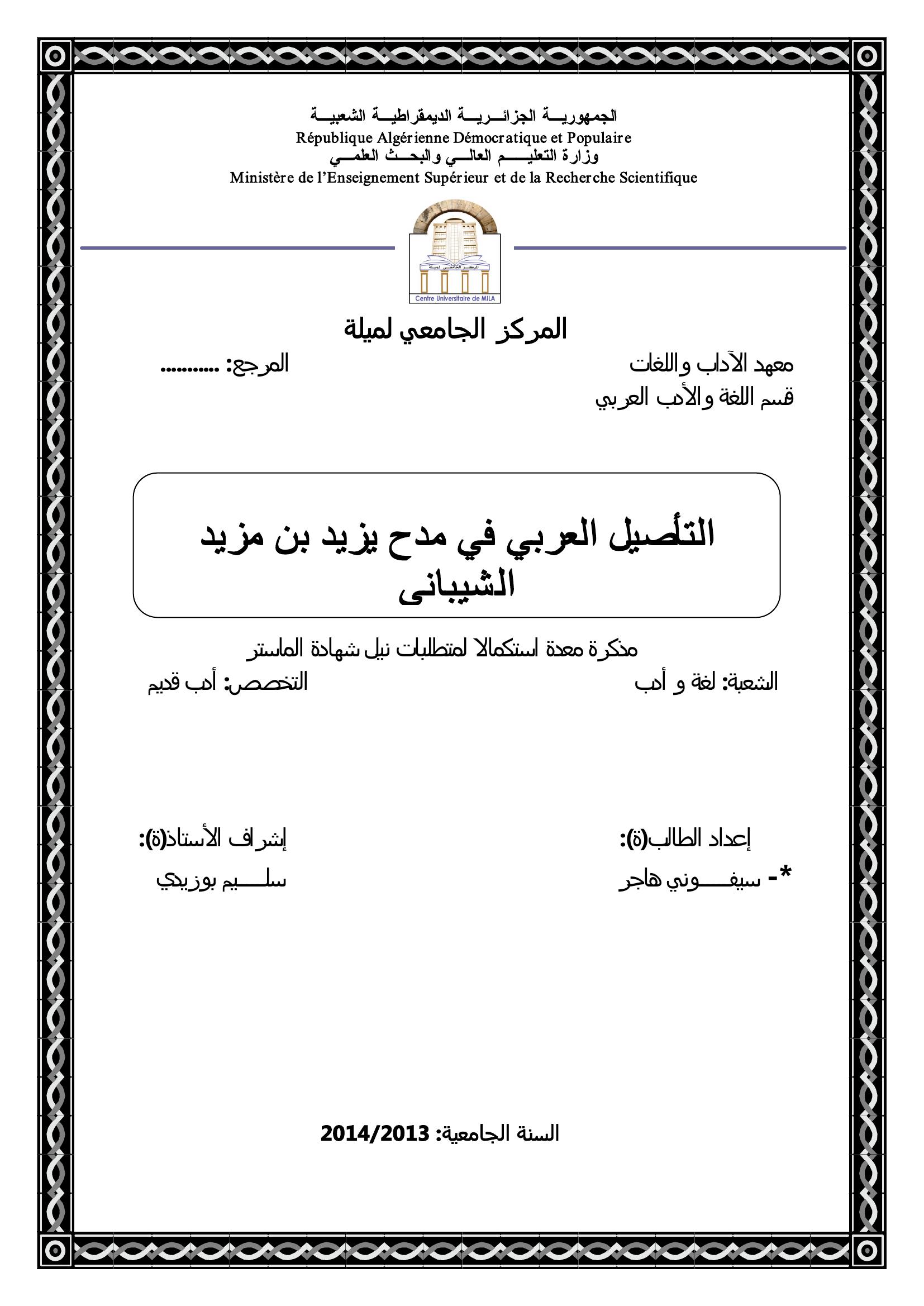 سيفوني هاجر & بوزيدي سليم (مشرفا) (2014). التأصيل العربي في مدح يزيد بن مزيد الشيباني - دراسة فنية موضوعية -.