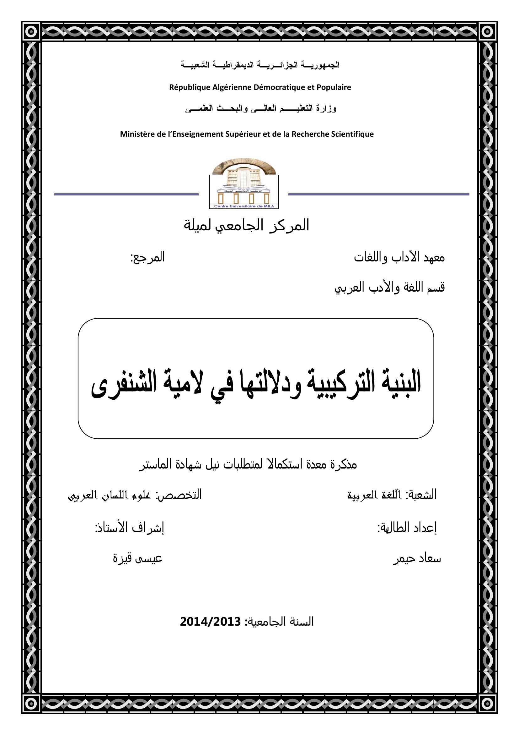 حيمر سعاد & قيزة عيسى ( مشرفا) (2014). البنية التركيبية ودلالاتها في لامية الشنفرى.