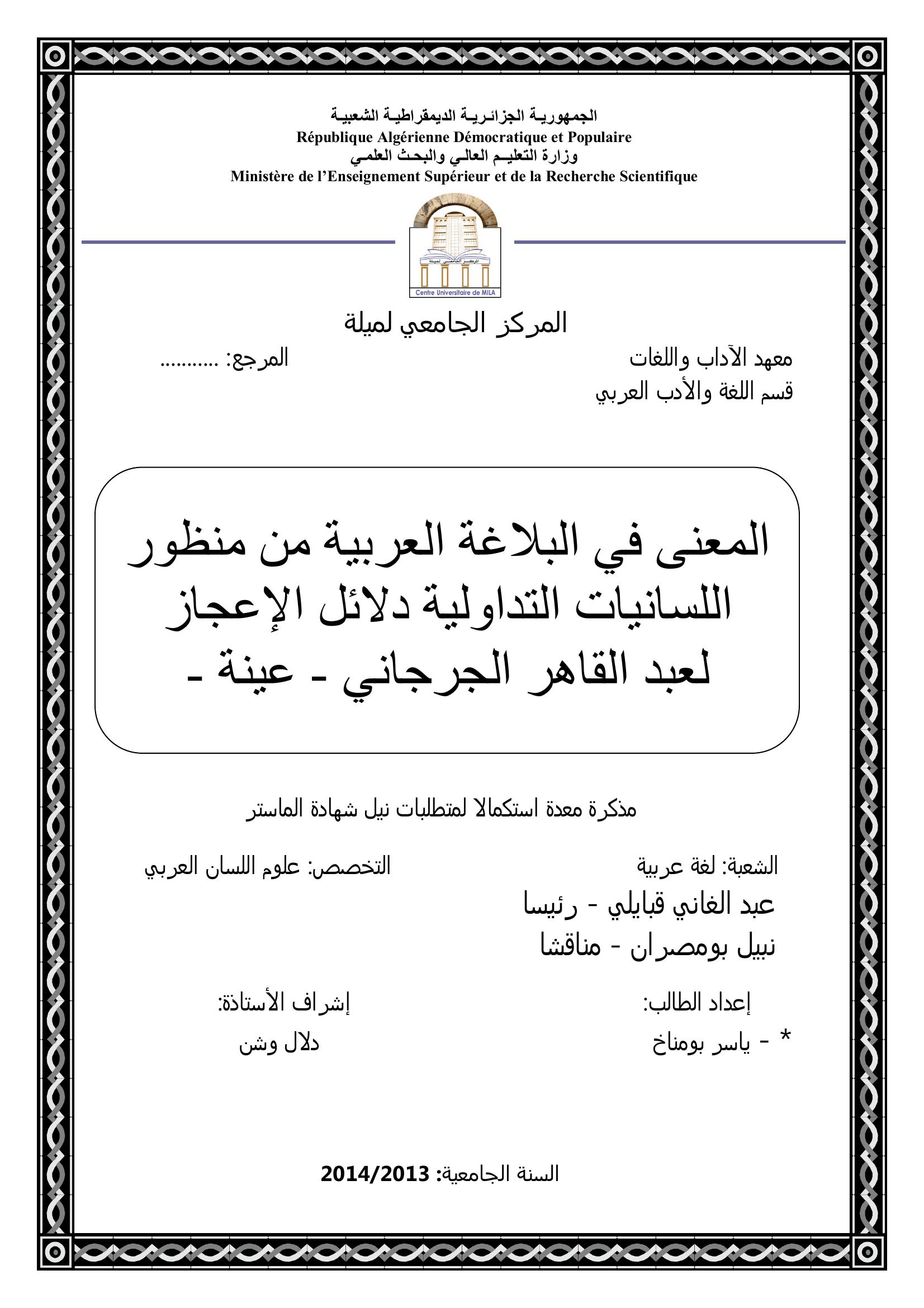 بومناخ ياسر & وشن دلال (مشرفا) (2014). المعنى في البلاغة العربية من منطور اللسانيات التداولية دلائل اللإعجاز لعبد القاهر الجرجاني - عينة -.