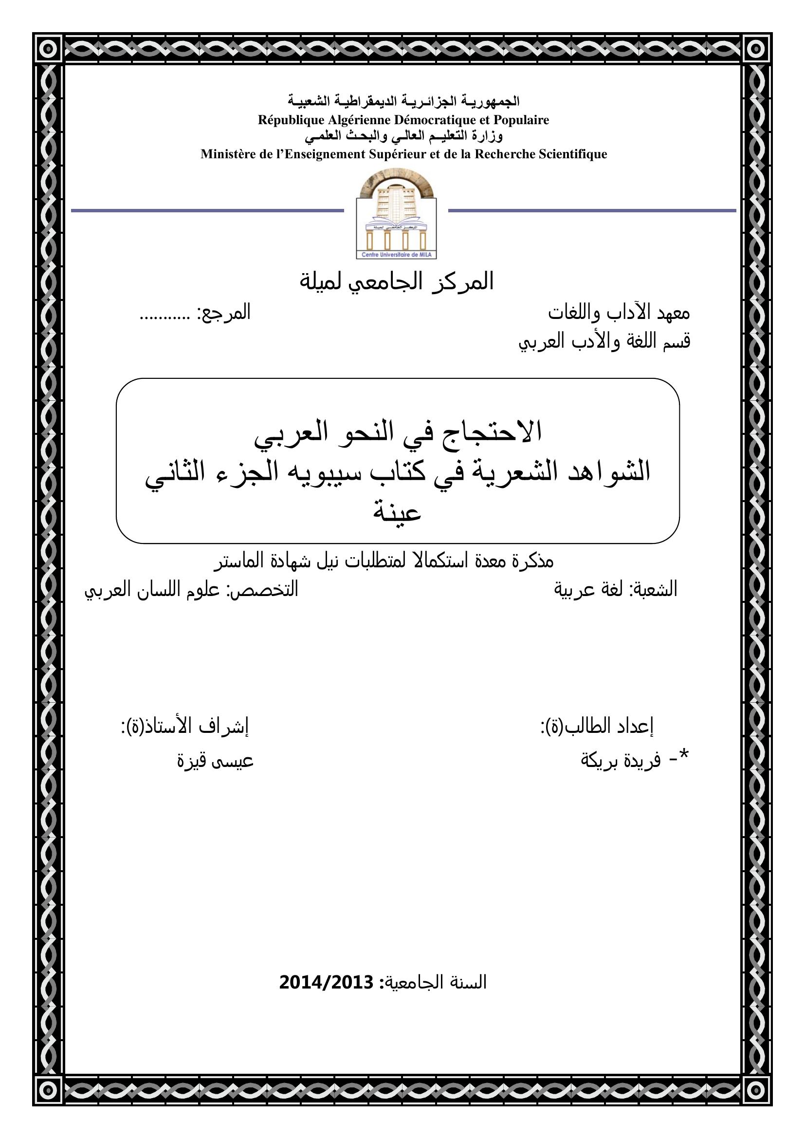 بريكة فريدة & قيزة عيسى ( مشرفا) (2014). الاحتجاج في النحو العربي الشواهد الشعرية في كتاب سيبويه الجزء الثاني عينة.