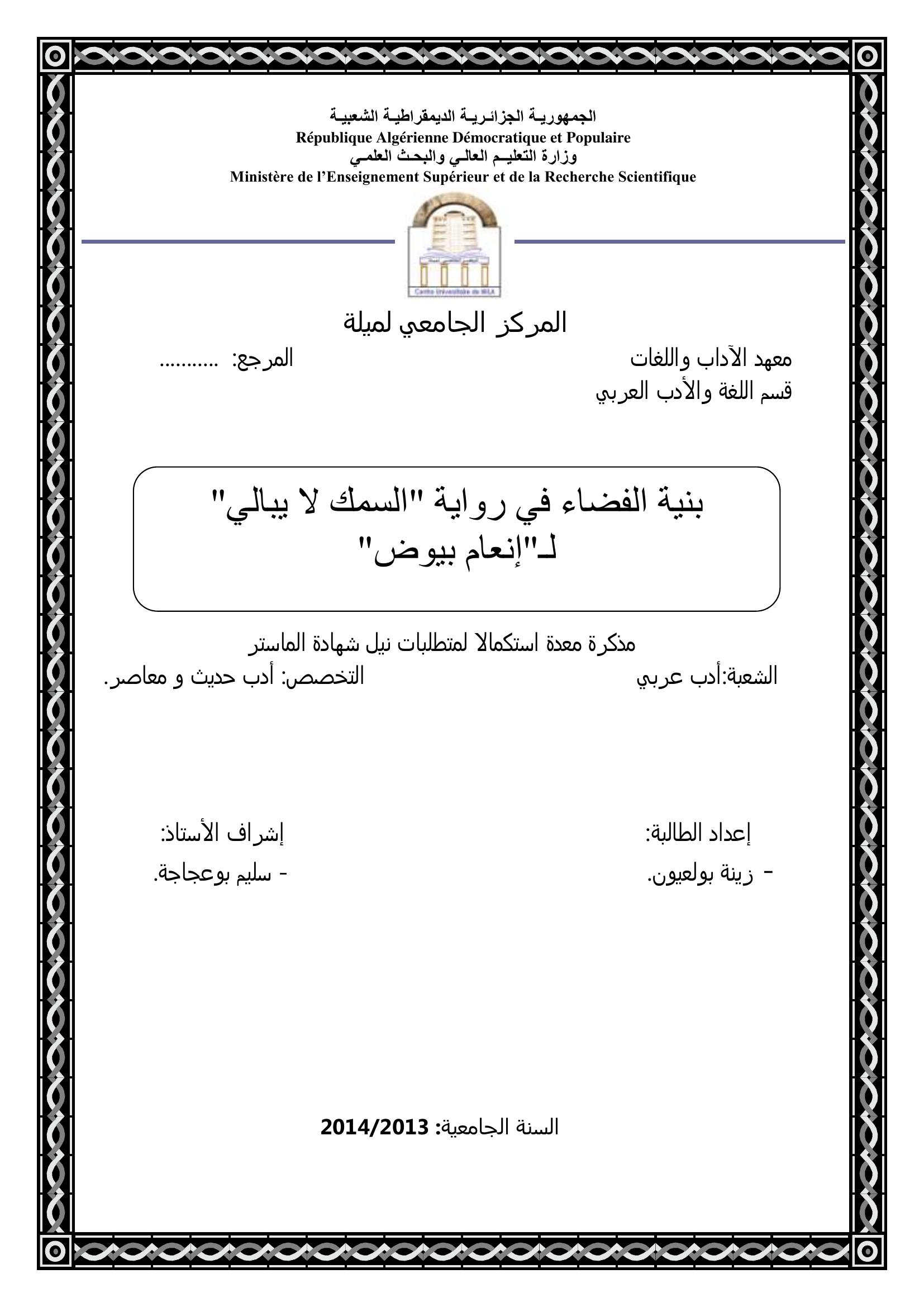 بولعيون زينة & بوعجاجة سليم (مشرفا) (2014). بنية الفضاء في رواية " السمك لا يبالي" ل " إنعام بيوض".