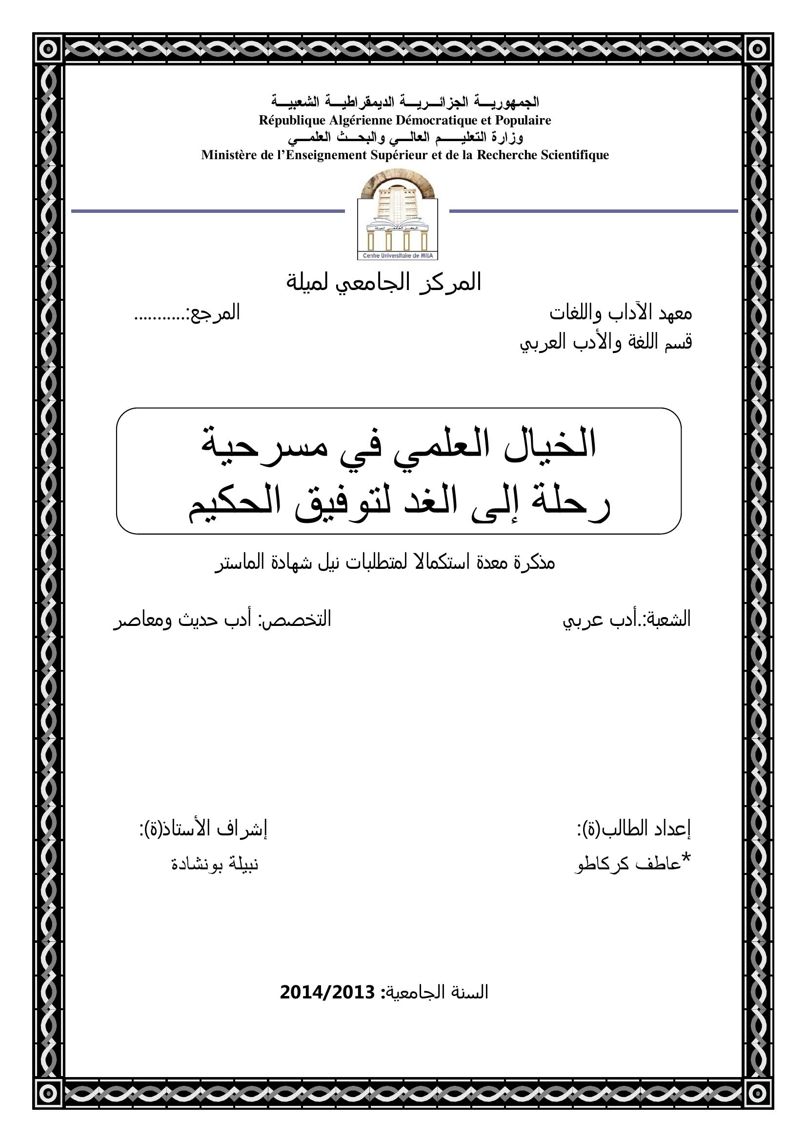 كركاطو عاطف & بونشادة نبيلة (مشرفا) (2014). الخيال العلمي في مسرحية رحلة إلى الغد لتوفيق الحكيم.