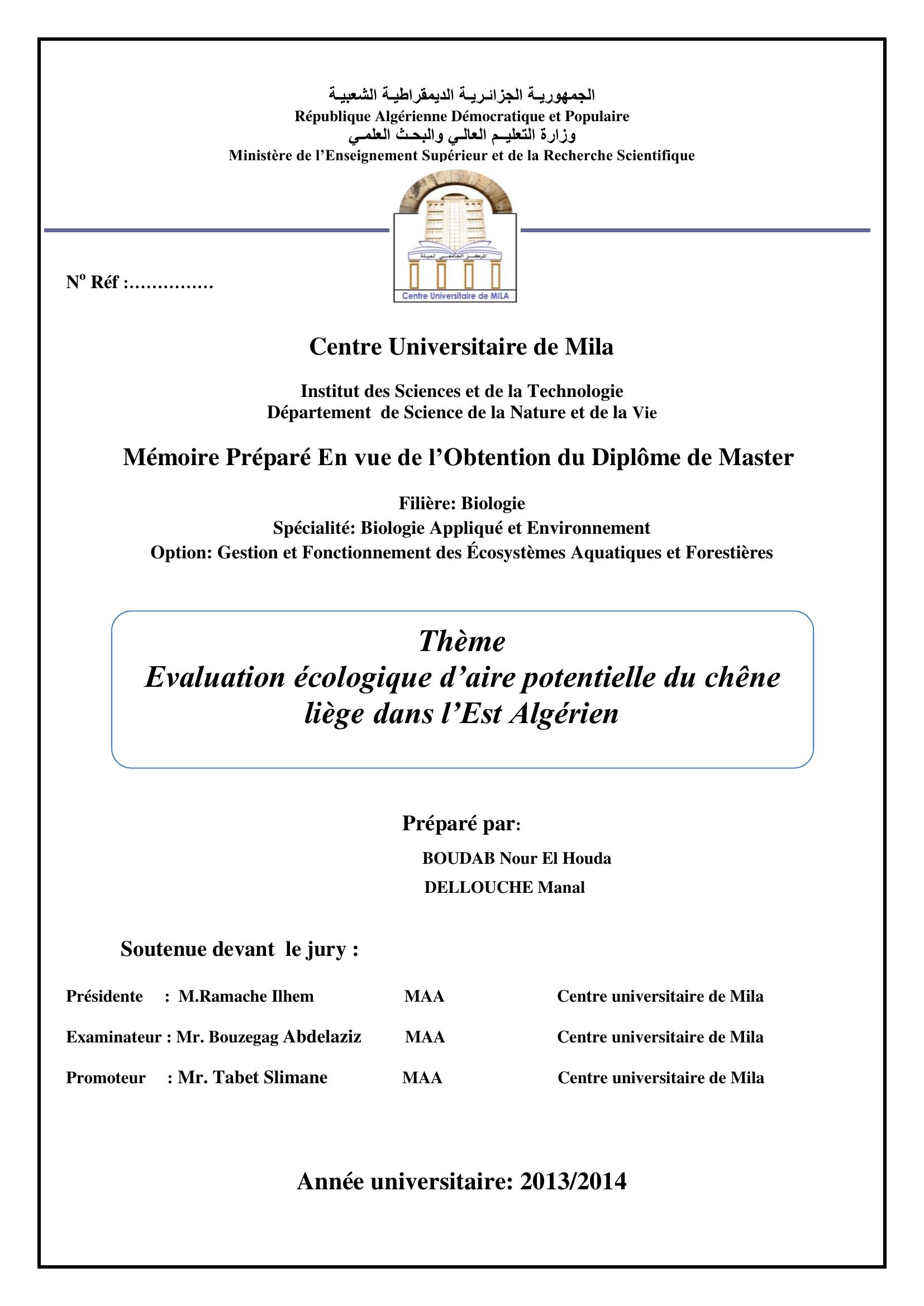 BOUDAB nour el houda (2014). Evaliation écologieque d'aire potentielle du chêne liège dans l'Est Algériene.