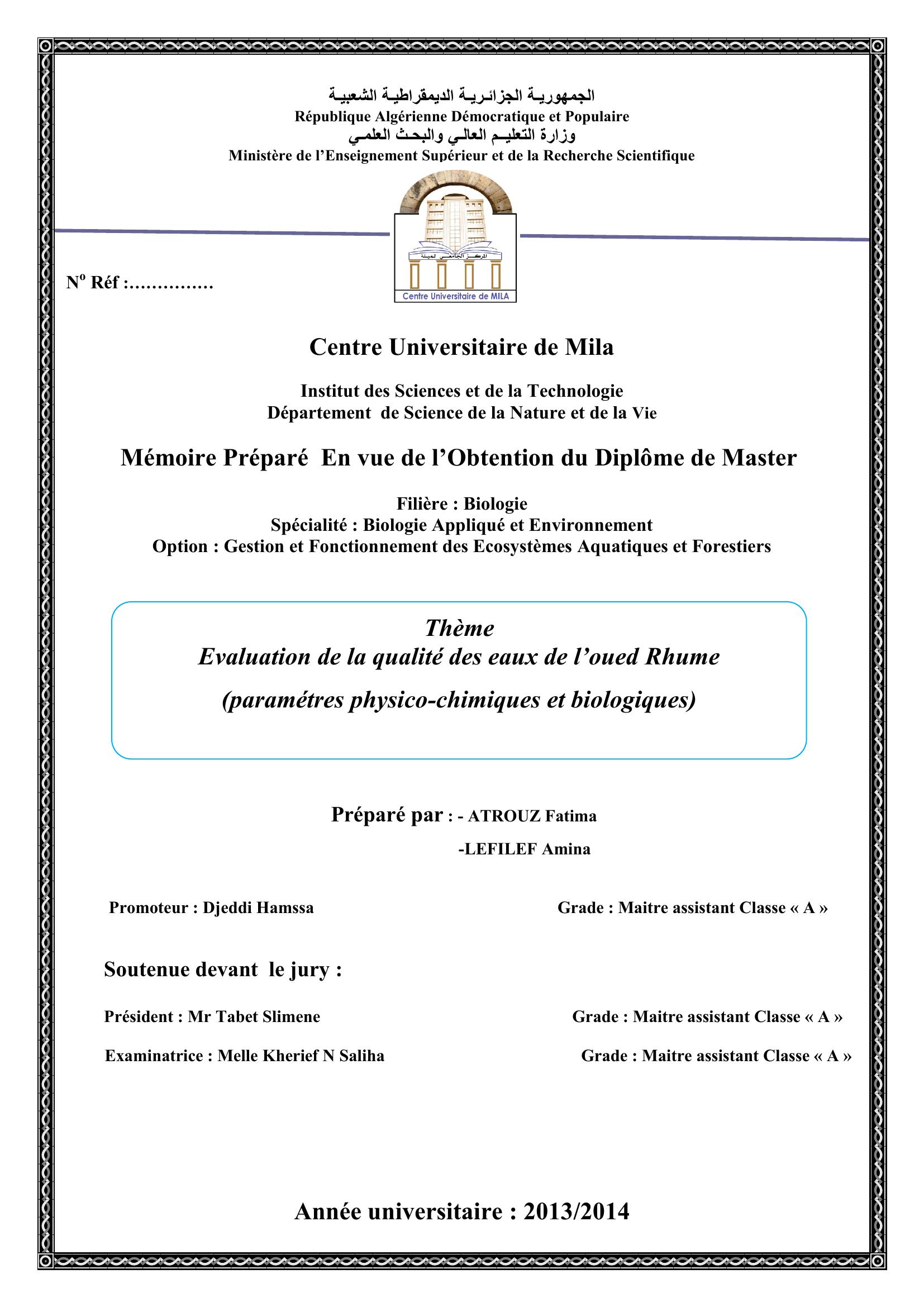 ATROUZ Fatima & Lefilef Amina (2014). Evaluation de la qualité des eaux de l'oued Rhumel (paramètre physico-chimiques et biologiques.