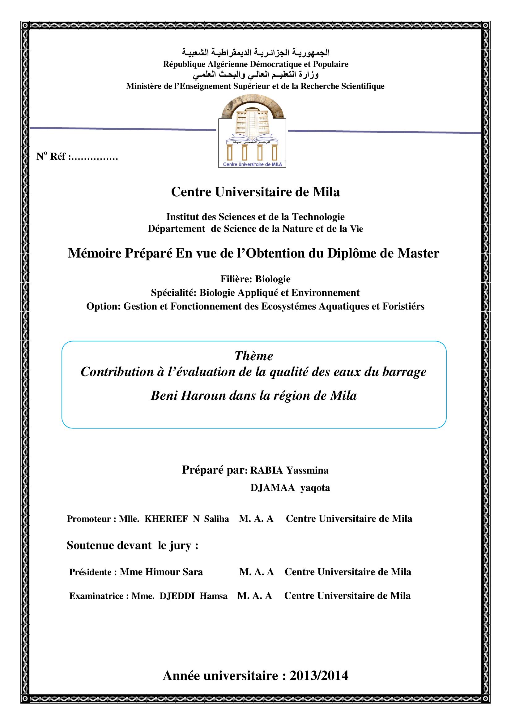 DJAMAA yaqota & RABIA yassmina (2014). Contribution à l'évaluation de la qualité des eaux du barrage beni haroun dan la région de Mila.