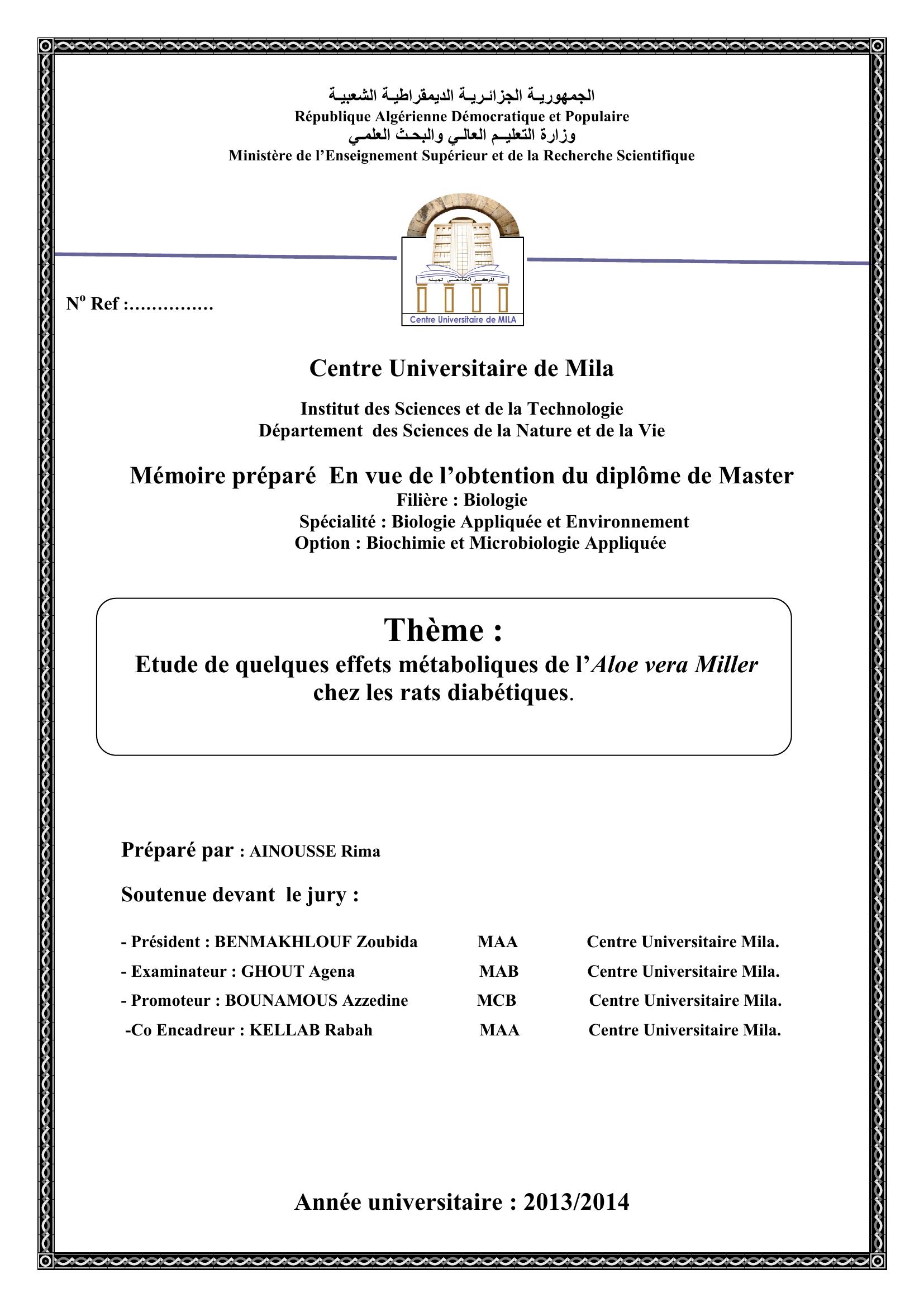 AINOUSSE rima (2014). Etude de quelques effets métaboliques de l'aloe vera miller chez les rats diabétiques.