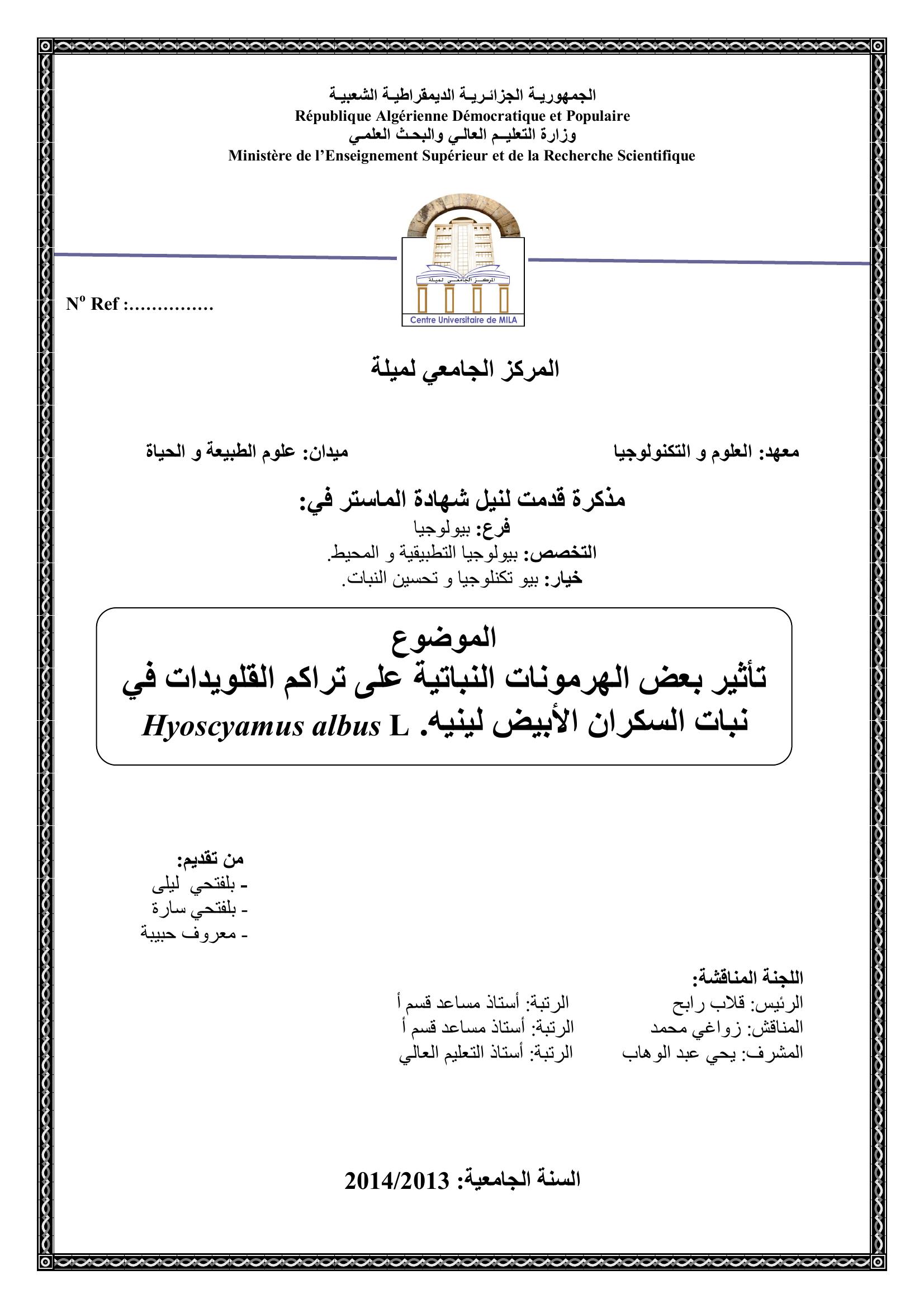 بلفتحي ليلى (2014). تأثير بعض الهرمونات االنباتية على تراكم القلويدات في نبات السكران الأبيض لينيه. Hyoscyamus albus L.