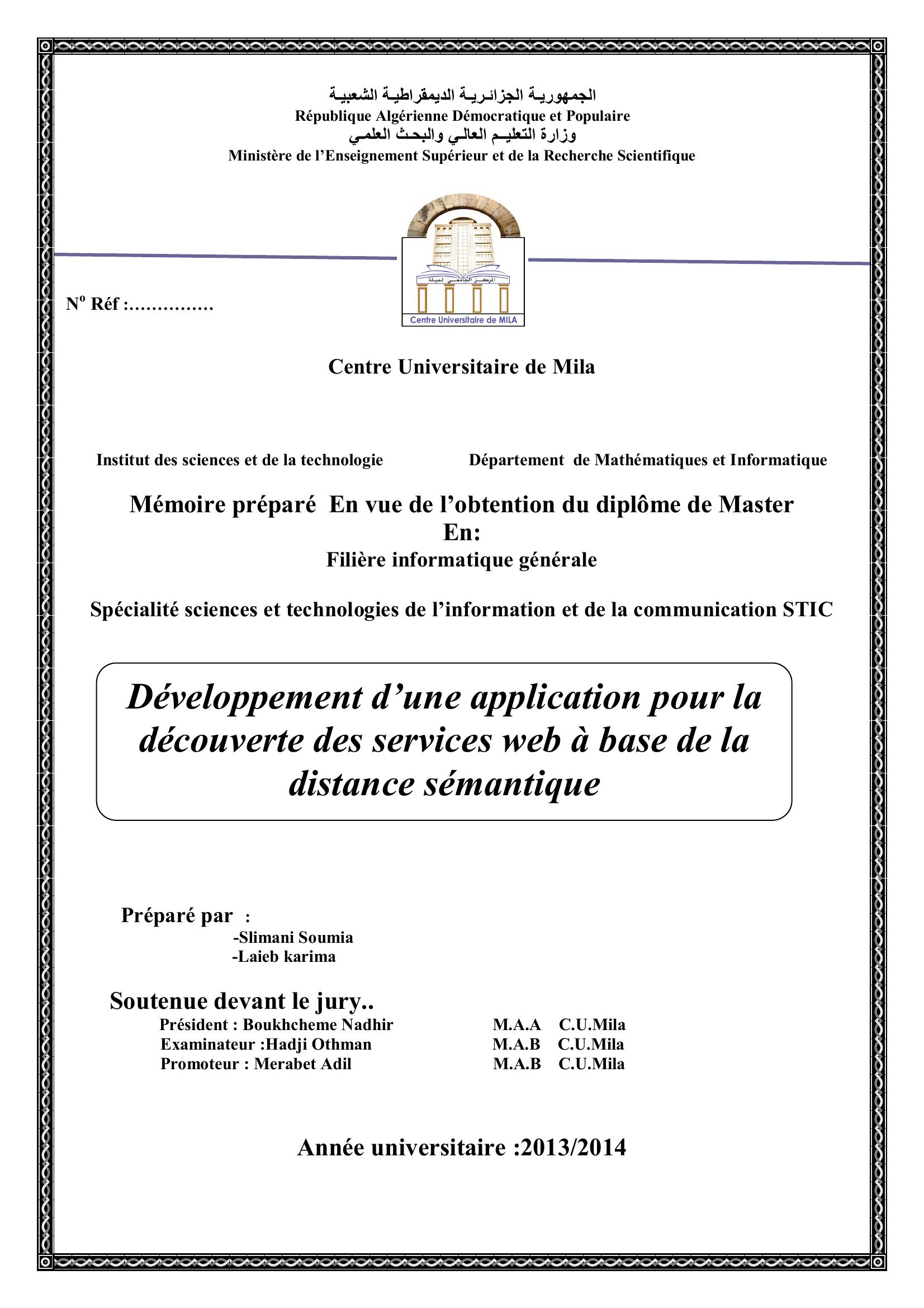 Slimani Soumia & Boukhcheme Nadhir Président, H. (2014). Développement d'une application pour la découverte des services web à base de la distance sémantique.