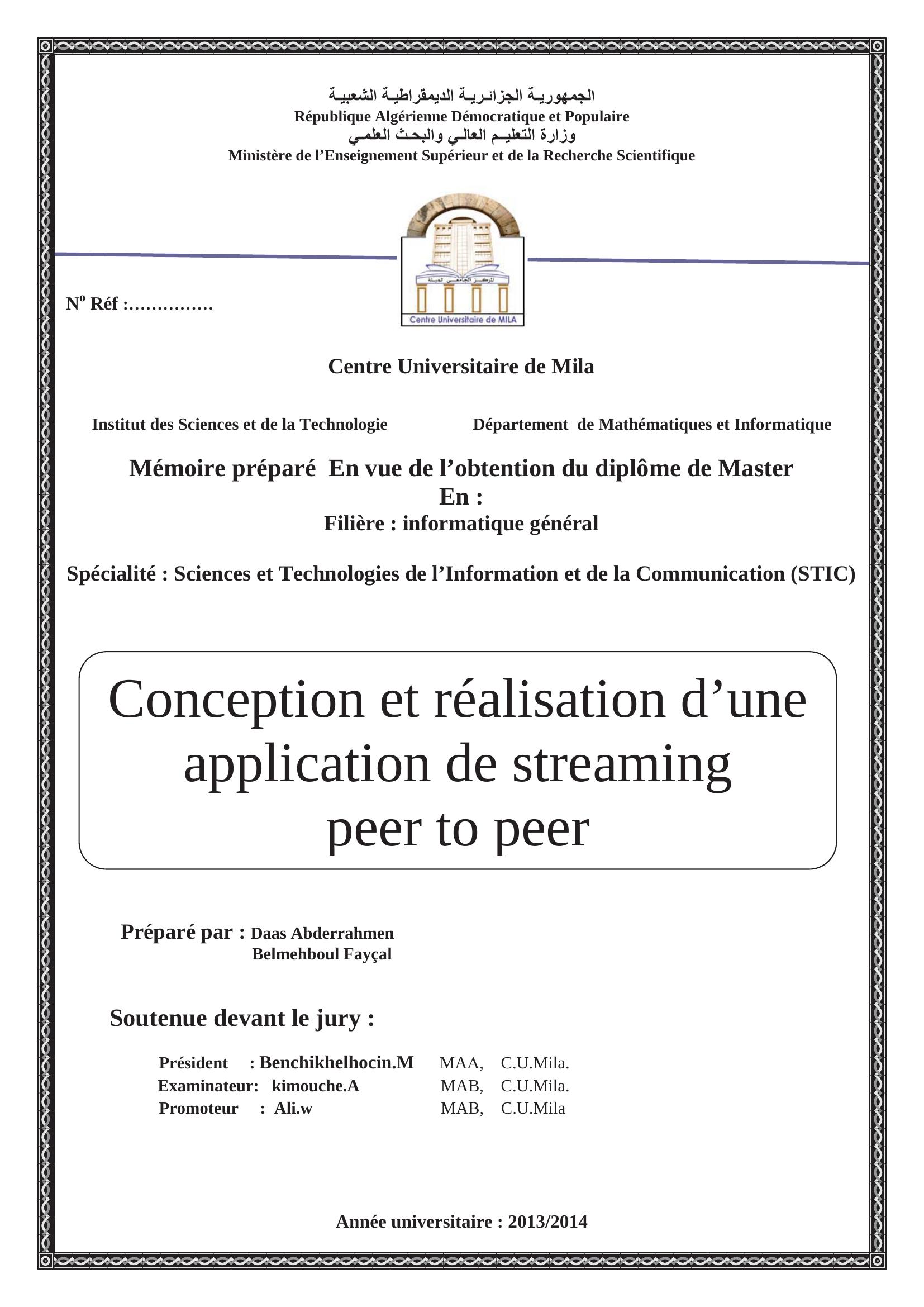 Daas Abderrahmene & Benchikhelhocin.M Président, k. (2014). Conception et réalisation d'une application de streaming peer to peer.