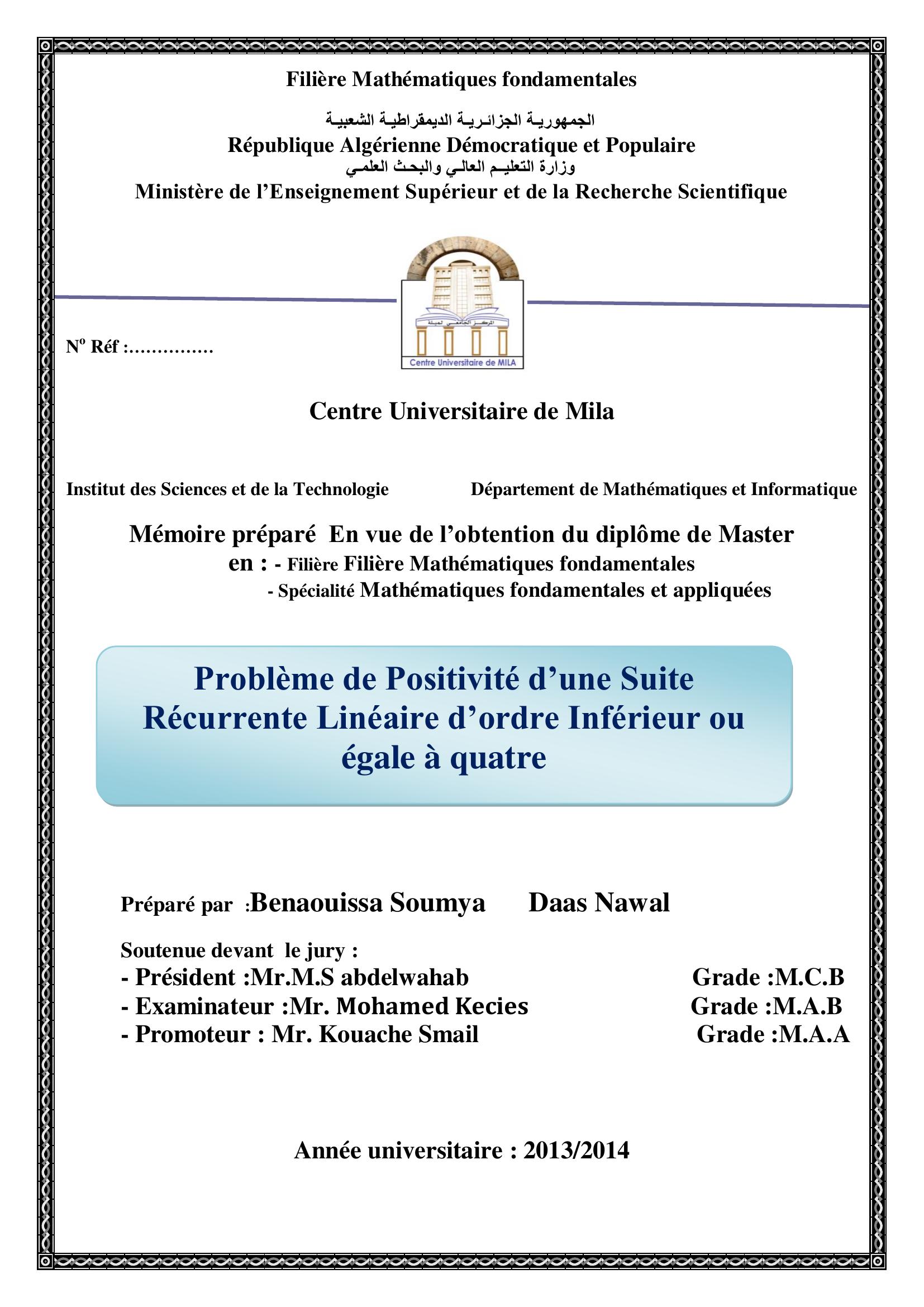 DAAS nawal & M.S abdelwahab président, M. (2014). Problème de positivité d'une suite récurrente linéaire d'ordre inférieur ou égale à quatre.