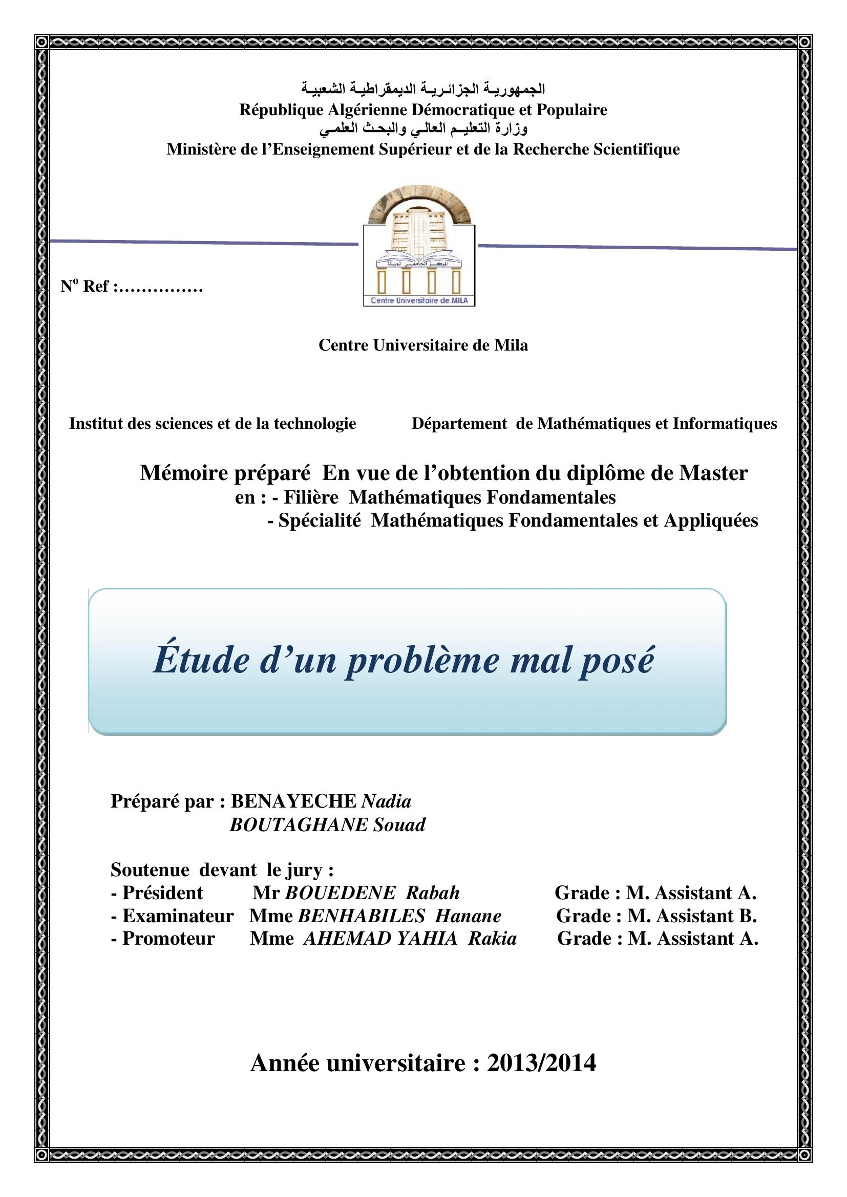 BENAYACHE nadia & Mr BOUEDENE Rabah Président, B. (2014). Etude d'un problème mal posé.