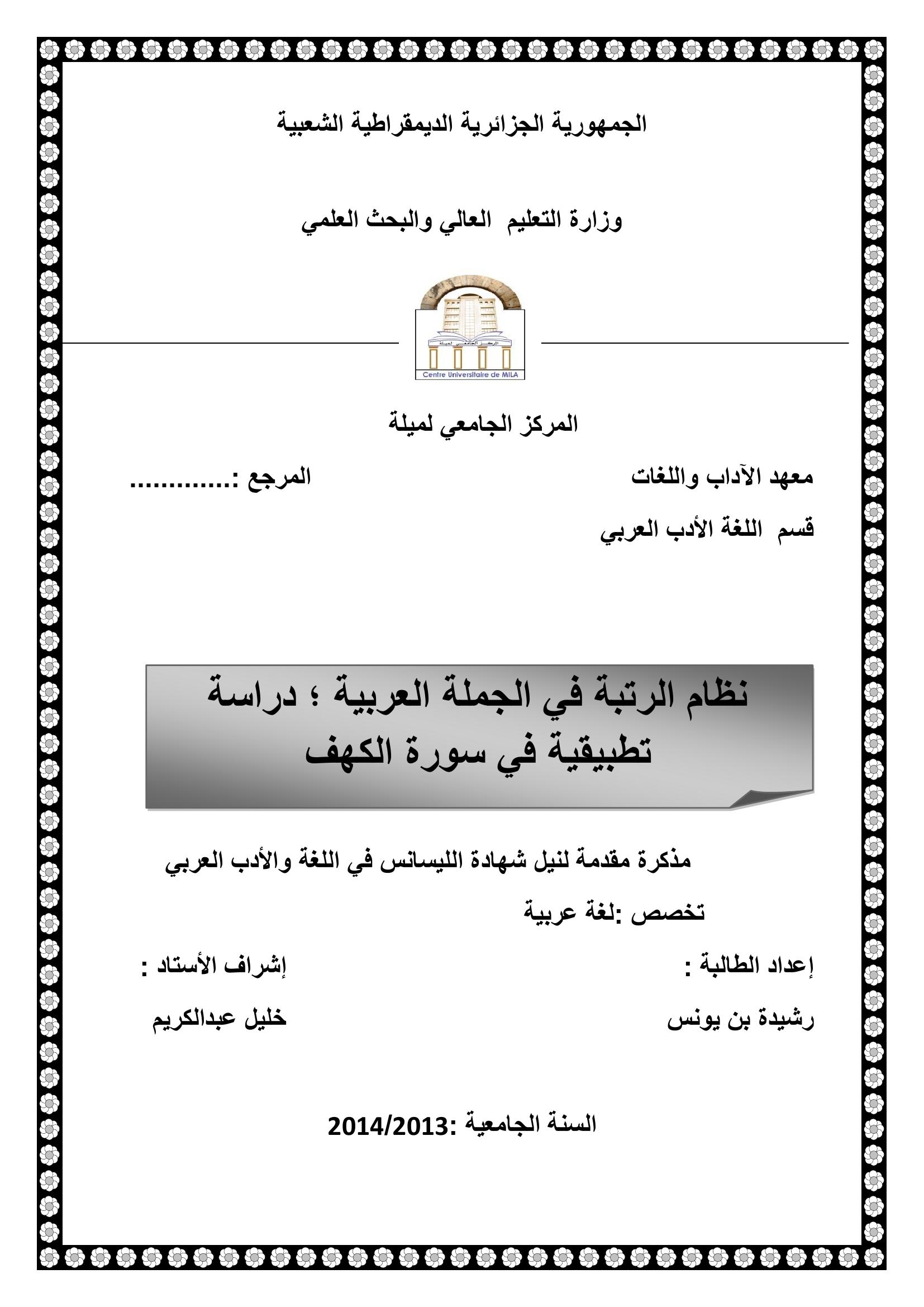 بن يونس رشيدة & خليل عبد الكريم (مشرفا) (2014). نظام الرتبة في الجملة العربية ، دراسة تطبيقية في سورة الكهف.