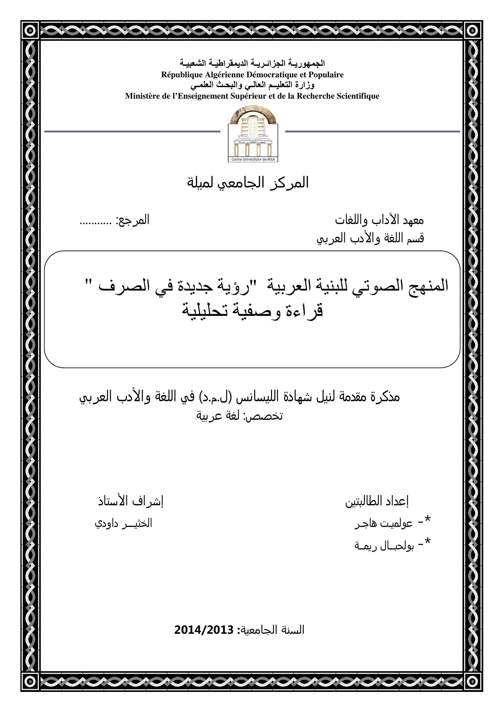 عولميت هاجر & الخثير داودي (مشرفا) (2014). المنهج الصوتي للبنية العربية "رؤية جديدة في الصرف" قراءة وصفية تحليلية.