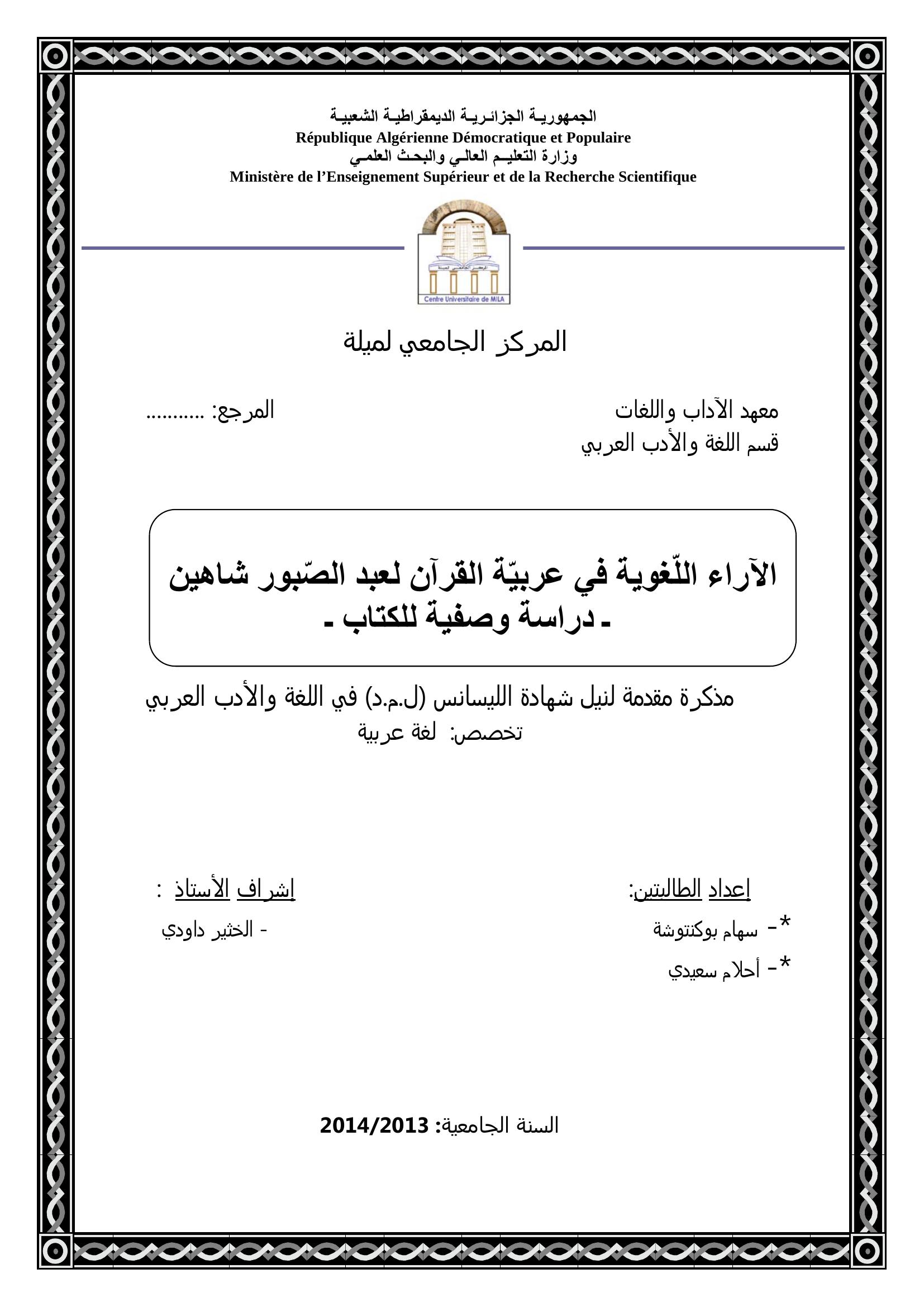 بوكنتوشة سهام & الخثير داودي (مشرفا) (2014). الآراء اللغوية في عربية القرآن لعبد الصبور شاهين - دراسة وصفية للكتاب -.