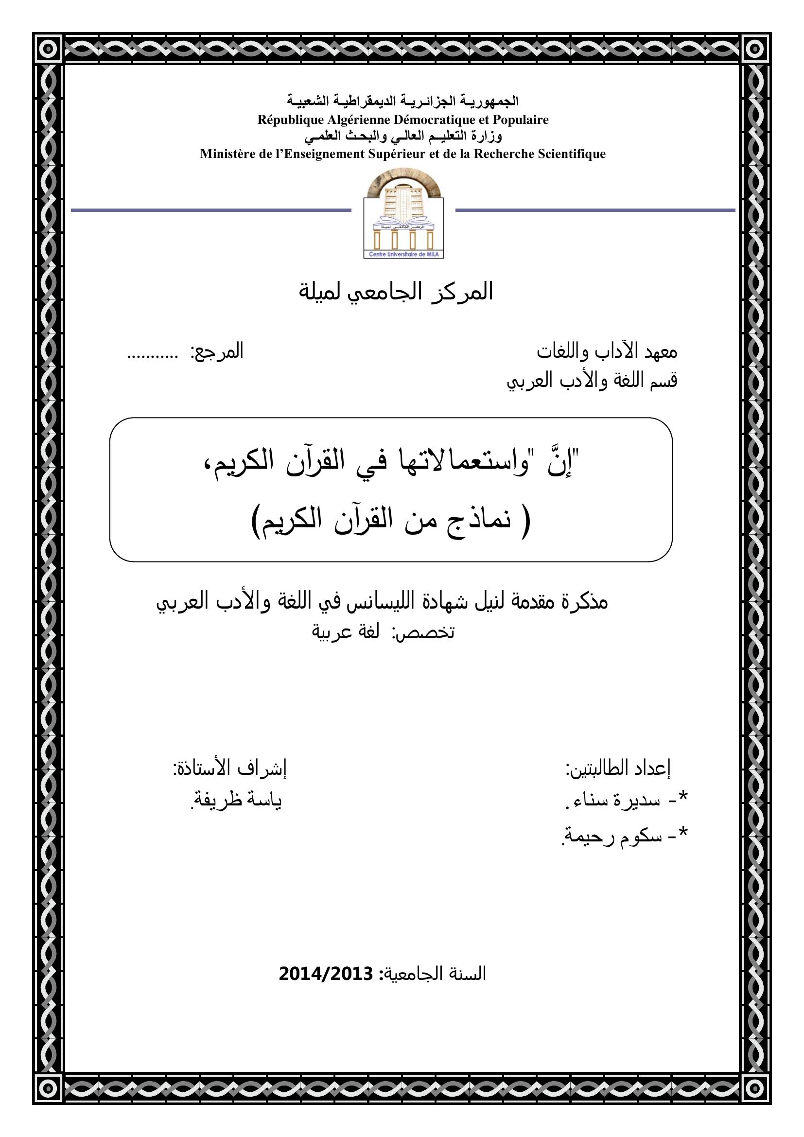 سديرة سناء et al. (2014). إن واستعمالاتها في القرآن الكريم - نمادج من القرآن الكريم -.