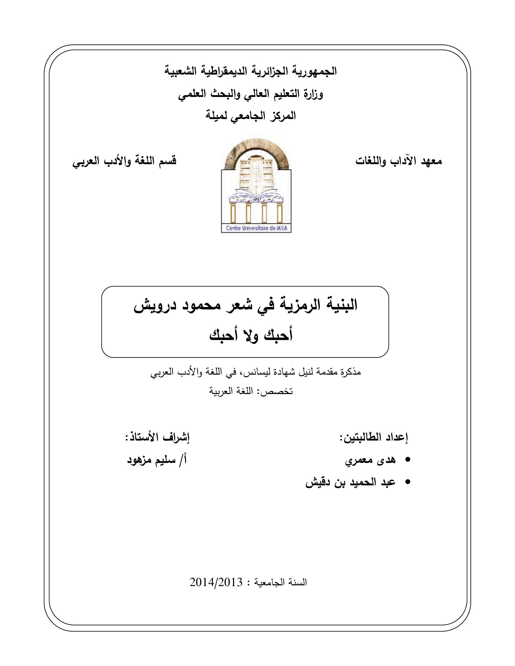 معمري هدى et al. (2014). البنية الرمزية في شعر محمود درويش " أحبك ولا أحبك".