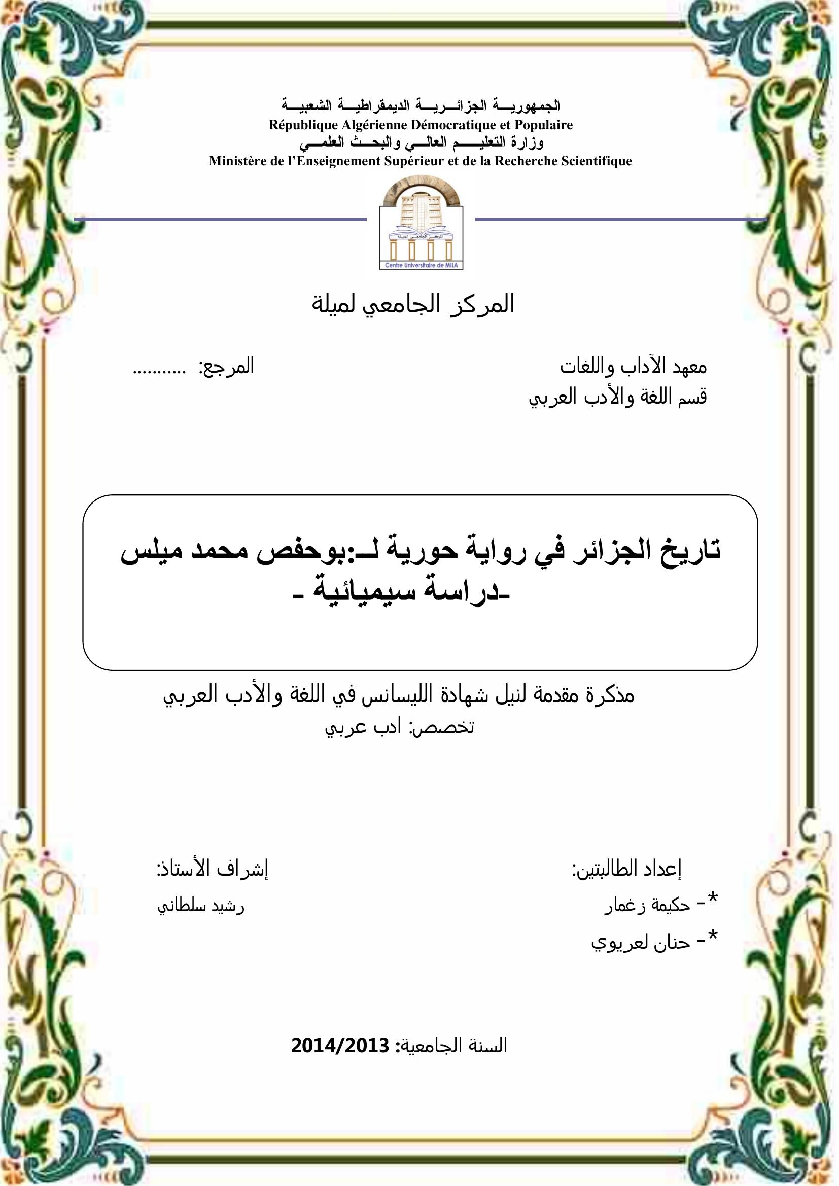 زغمار حكيمة et al. (2014). تاريخ الجزائر في رواية حورية لـ : بوحفص محمد ميلس - دراسة سيميائية -.