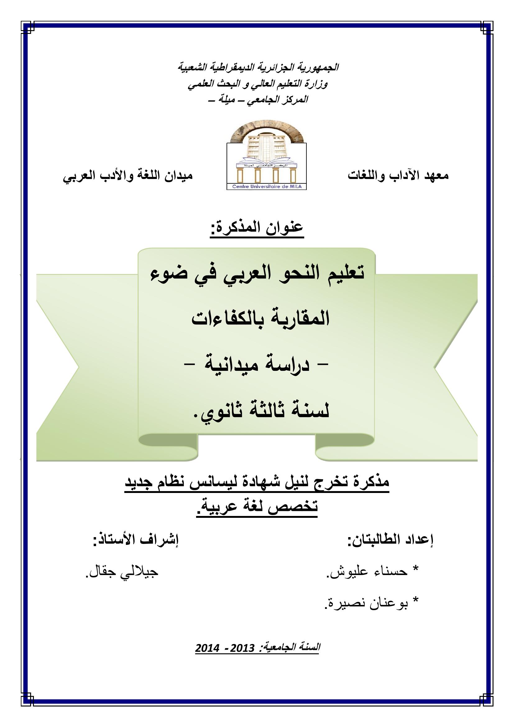 عليوش حسناء et al. (2014). تعليم النحو العربي في ضوء المقاربة بالكفاءات -دراسة ميدانية لسنة ثالثة ثانوي-.